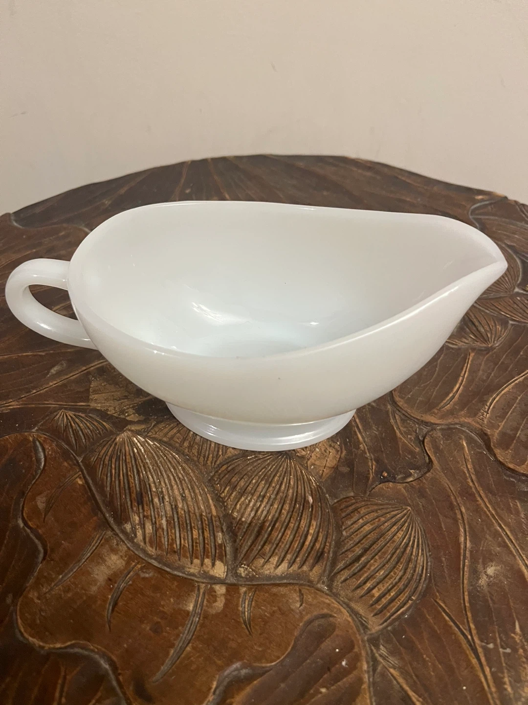 Classic white milk glass gravy boat with a handle and pour spout. This dish is perfect for serving gravies and sauces. Milk glass construction.