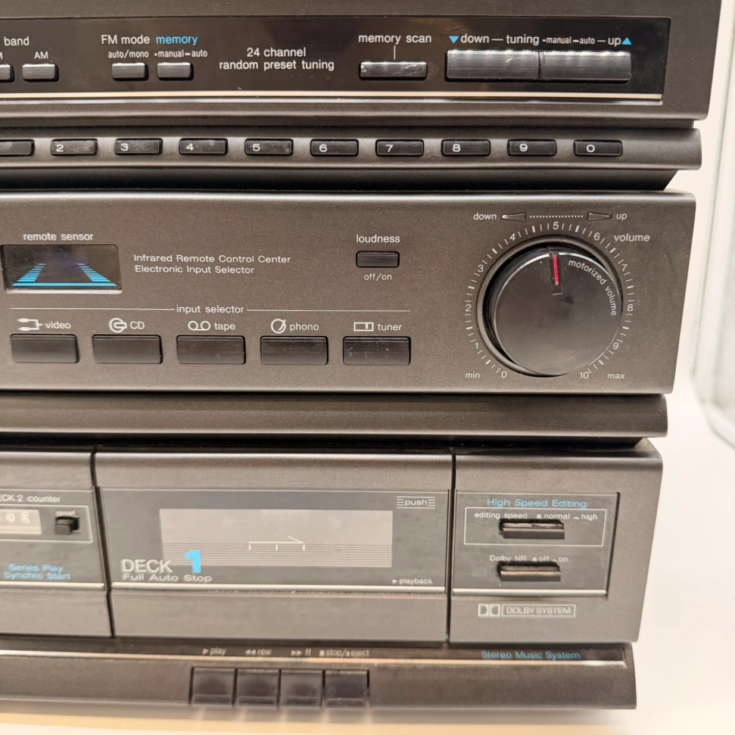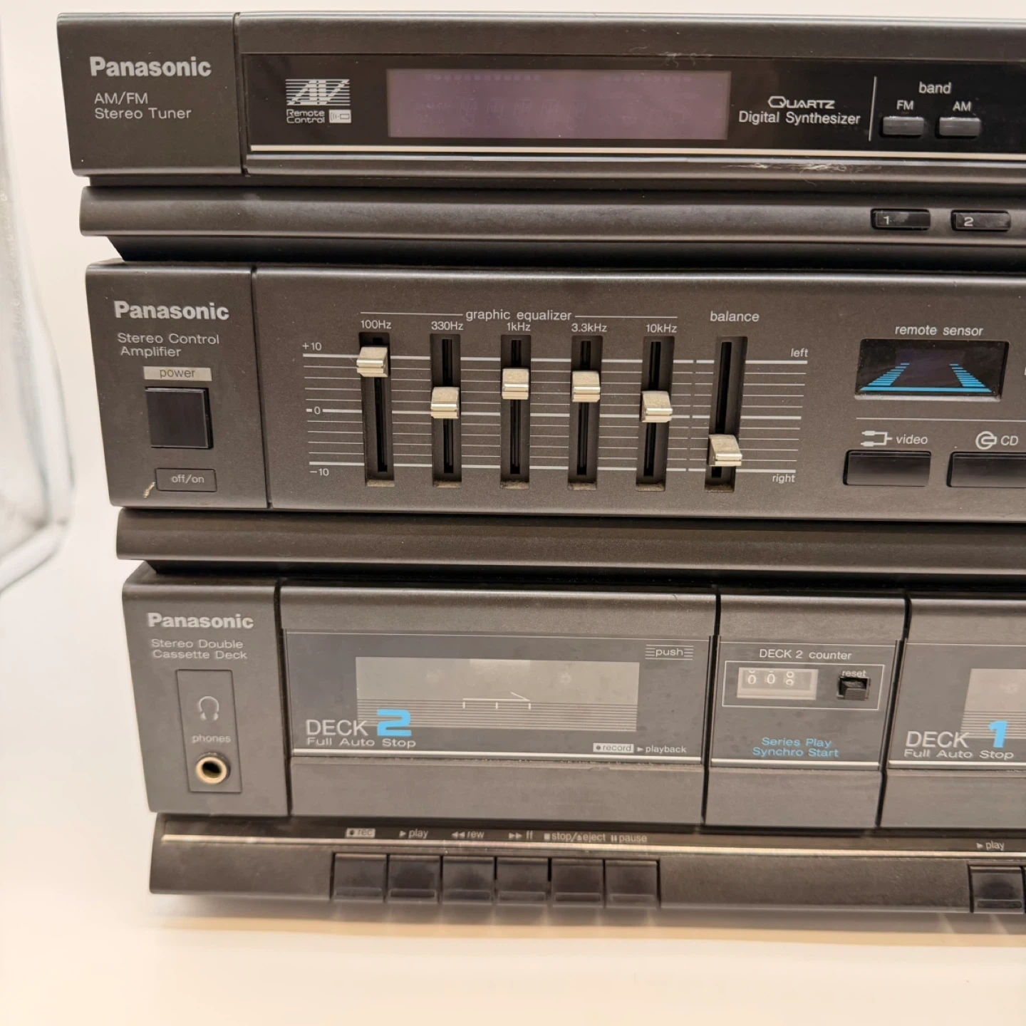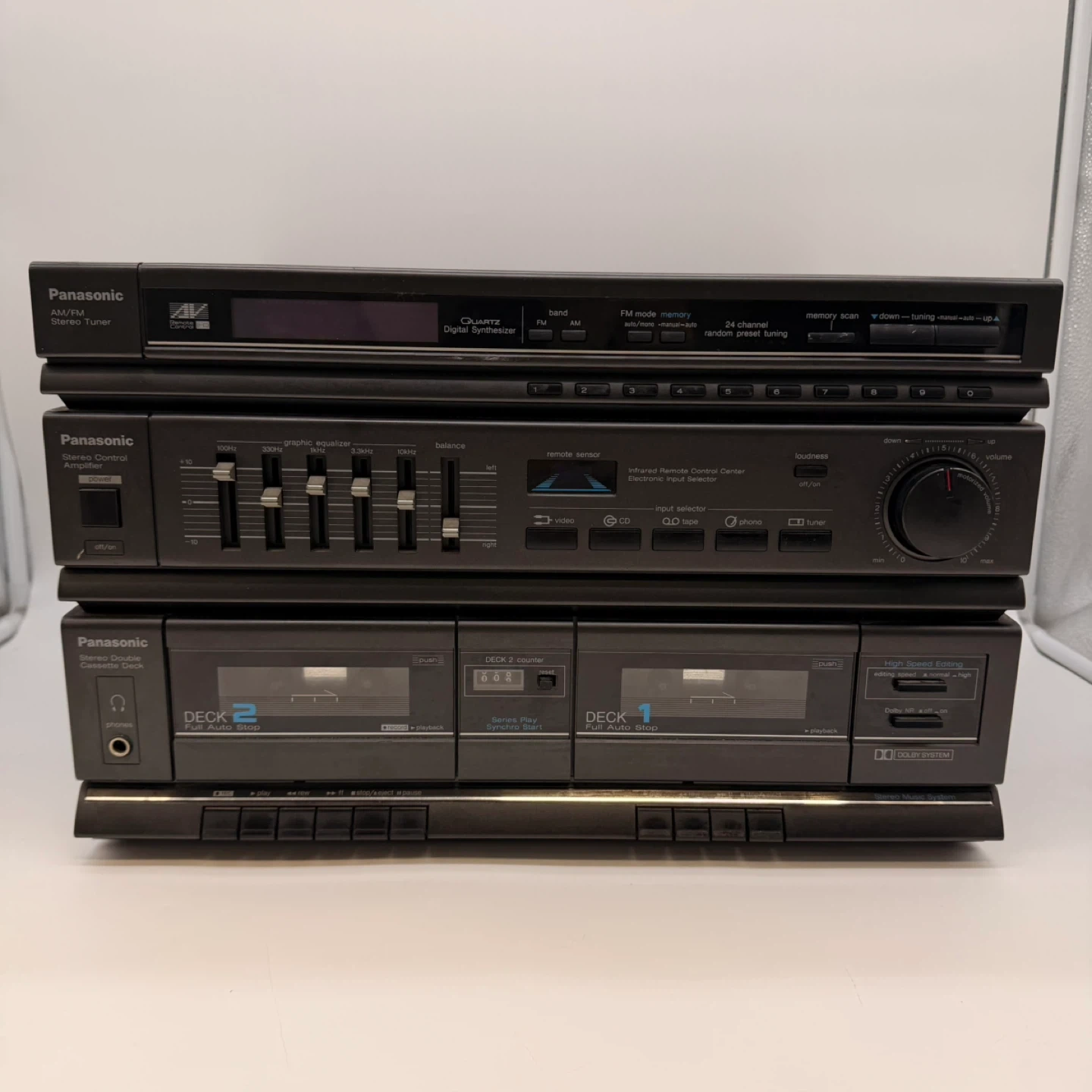 Vintage Panasonic stereo music system in tested and working condition. Includes AM/FM tuner, dual cassette deck, graphic equalizer, and amplifier. All functions tested and working properly. Classic 80s/90s design with great vintage sound. ✔️ Radio works ✔️ Cassette decks work ✔️ Controls and EQ responsive ✔️ Power cord included Condition: Used with normal cosmetic wear from age. 📍 Pickup: North York 🚚 Delivery available within GTA for extra fee 905 rack 1