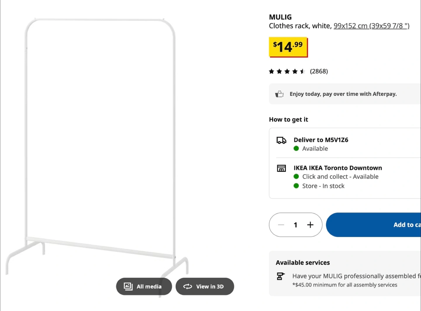Selling a white IKEA MULIG clothes rack. It measures 99x152 cm (39x59 7/8 "). Originally bought for $14.99.