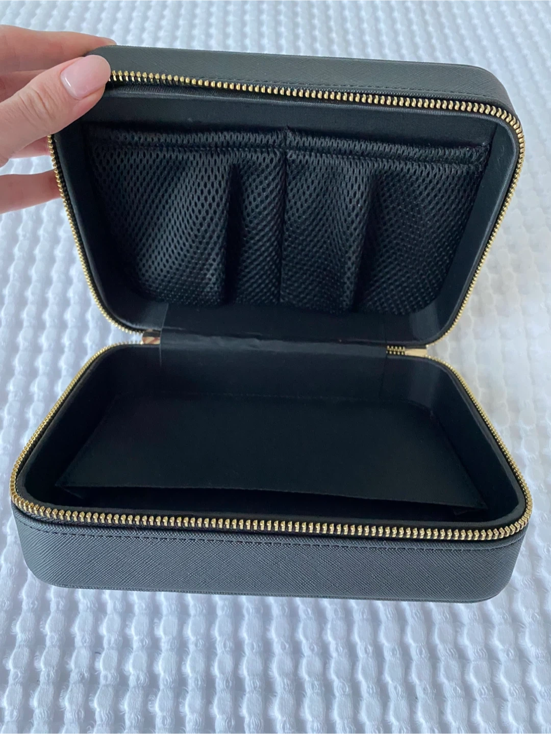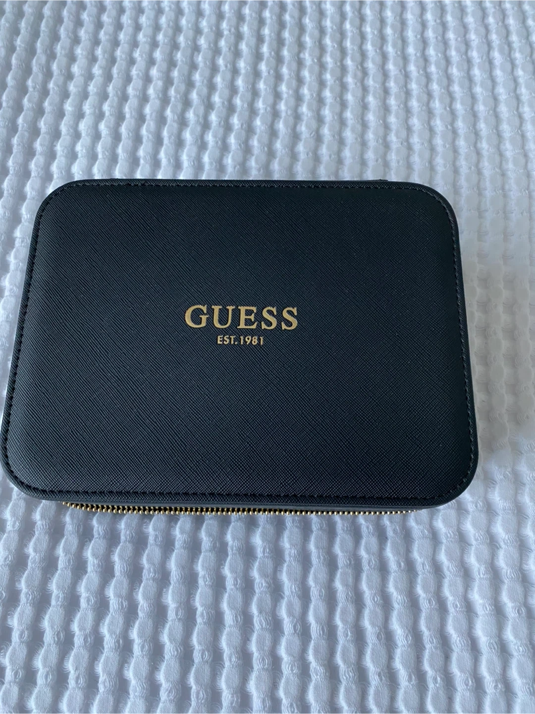 Brand new. Black jewellery organizer case by Guess. It has a zippered closure and interior compartments for storage. Perfect for travel or keeping your accessories tidy!