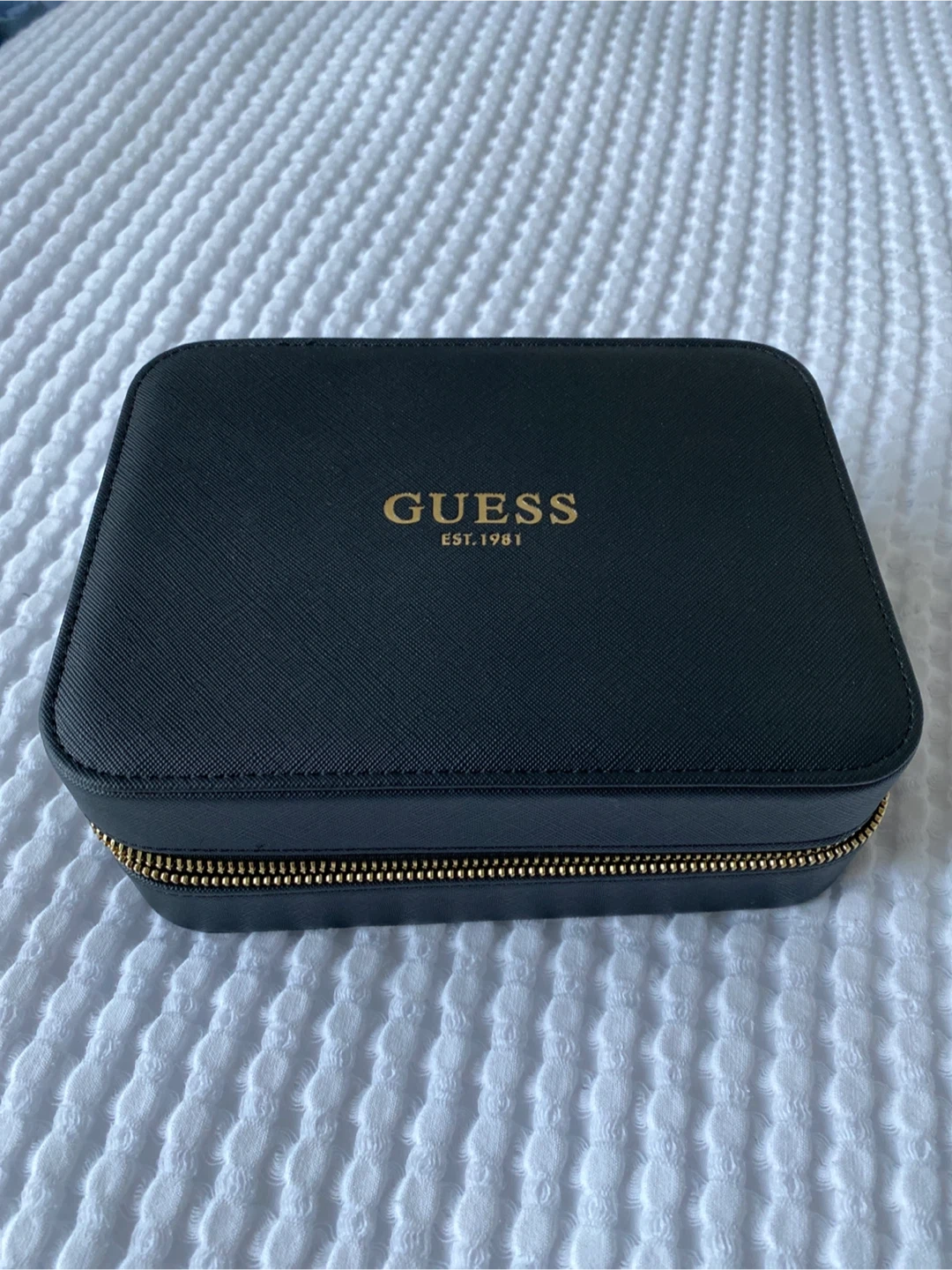 Brand new. Black jewellery organizer case by Guess. It has a zippered closure and interior compartments for storage. Perfect for travel or keeping your accessories tidy!