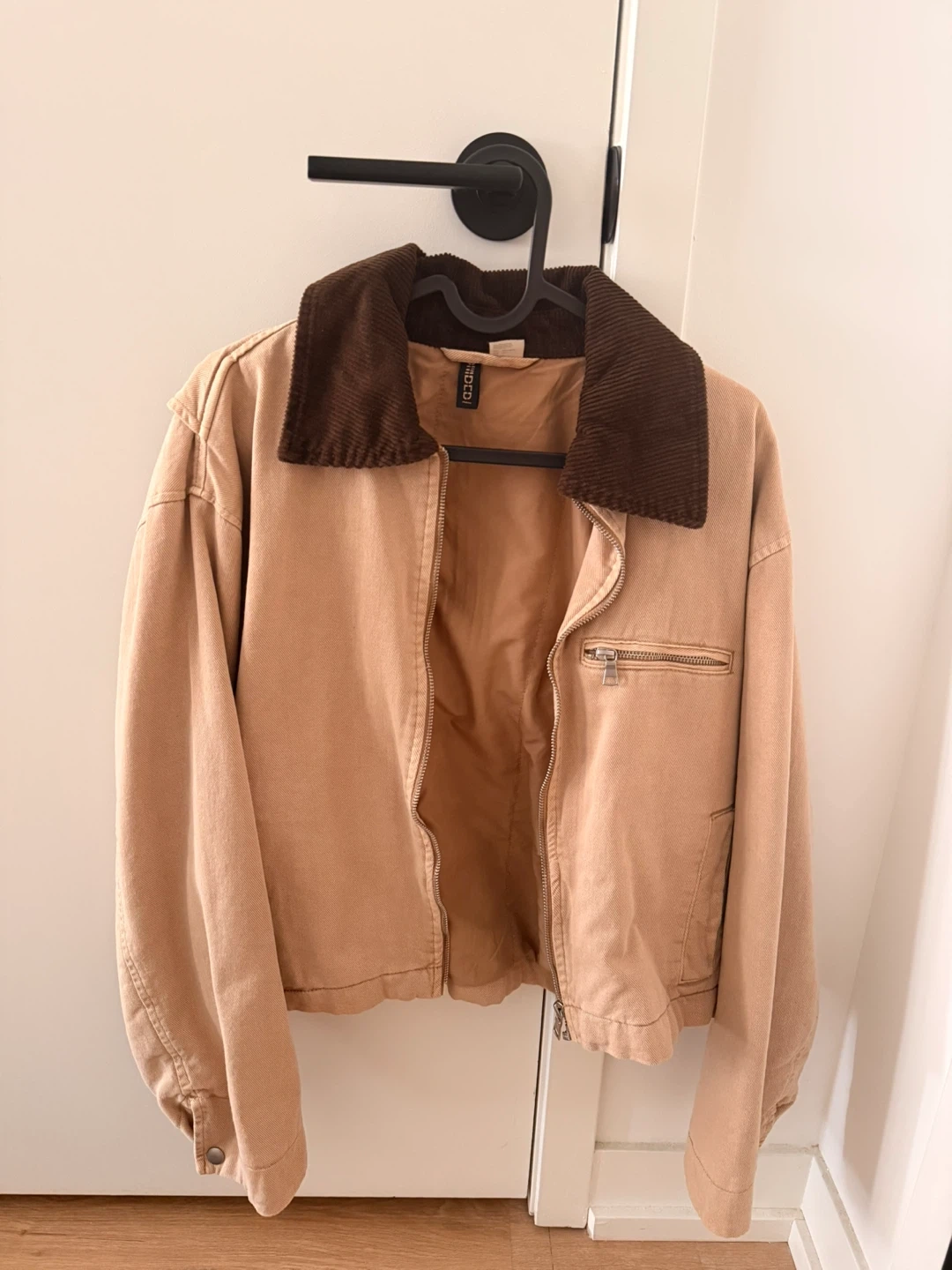 This H&M bomber jacket comes in a tan colour with a dark brown corduroy collar. It's a size small with a zip-up front and a chest zip pocket. The jacket is great for cooler weather!