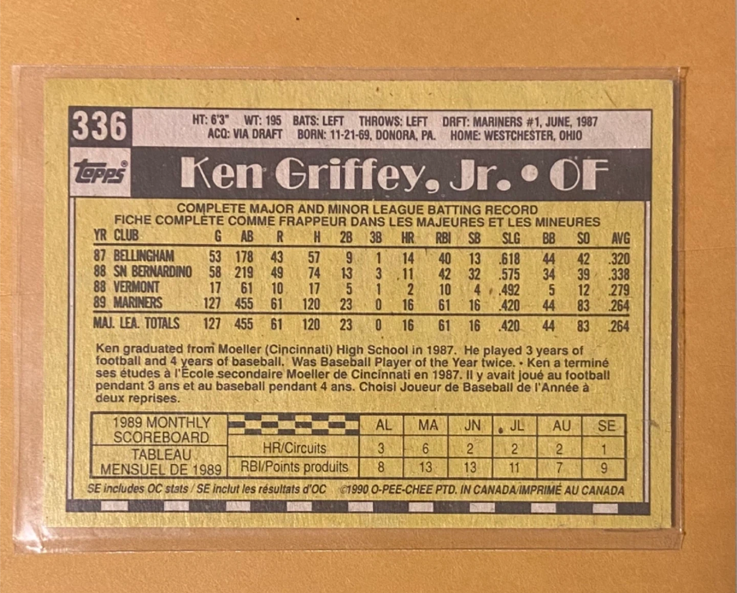 This is a 1989 Topps baseball card featuring Ken Griffey Jr. It shows his career stats and biographical information. The card also includes a 1989 monthly scoreboard.