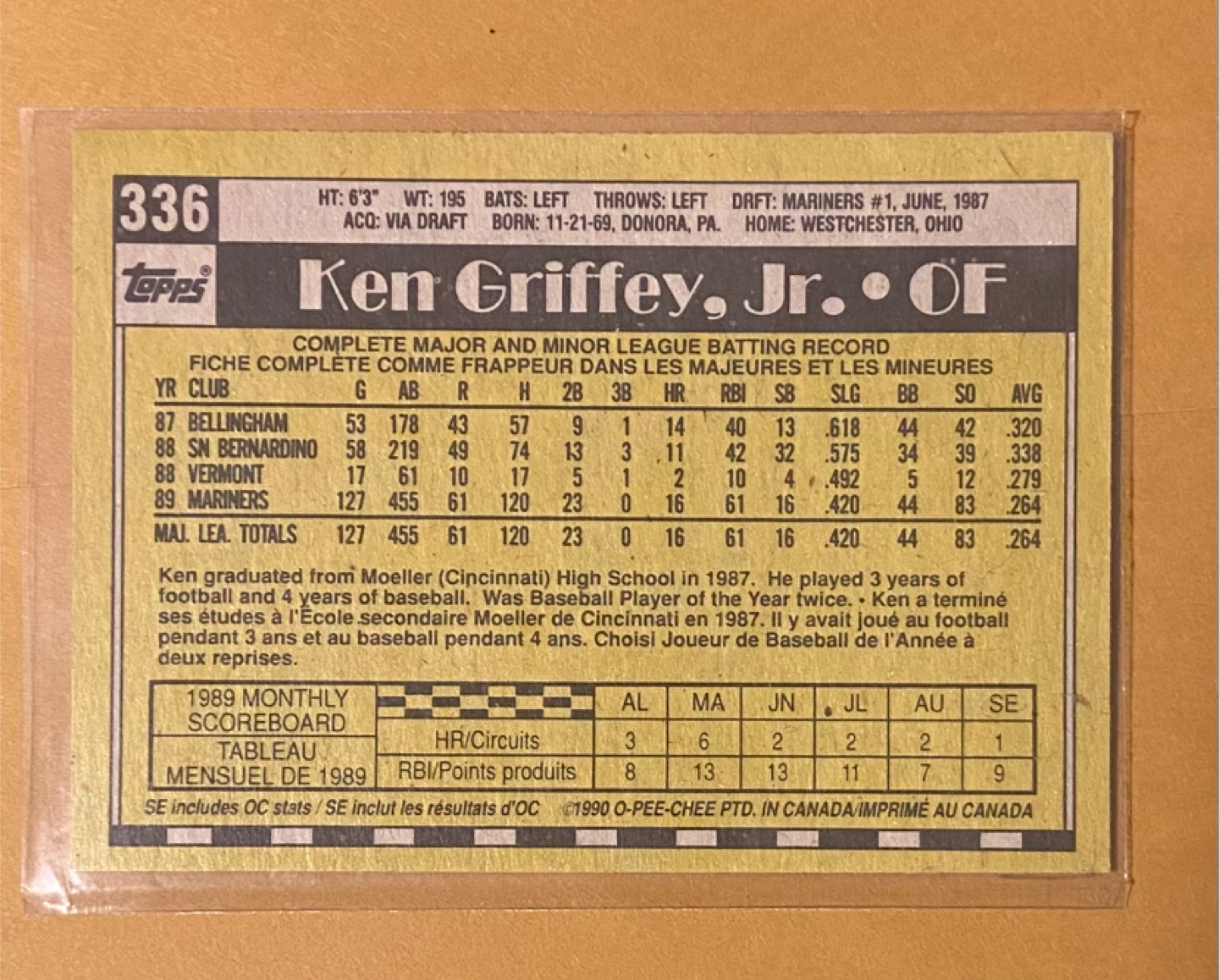 This is a 1989 Topps baseball card featuring Ken Griffey Jr. It shows his career stats and biographical information. The card also includes a 1989 monthly scoreboard.