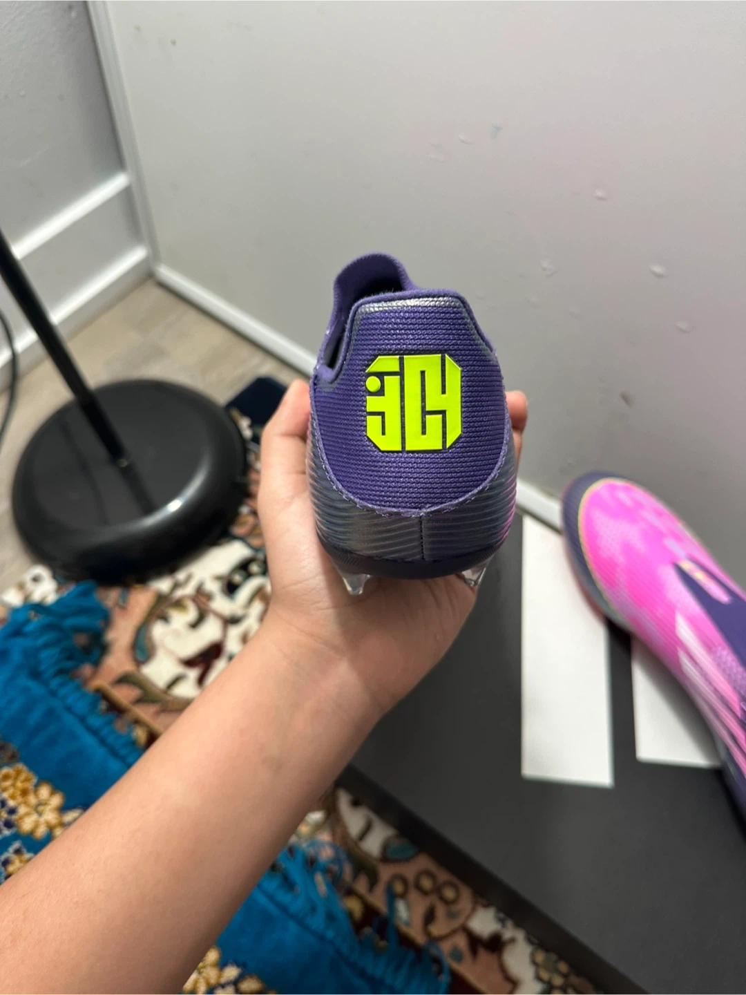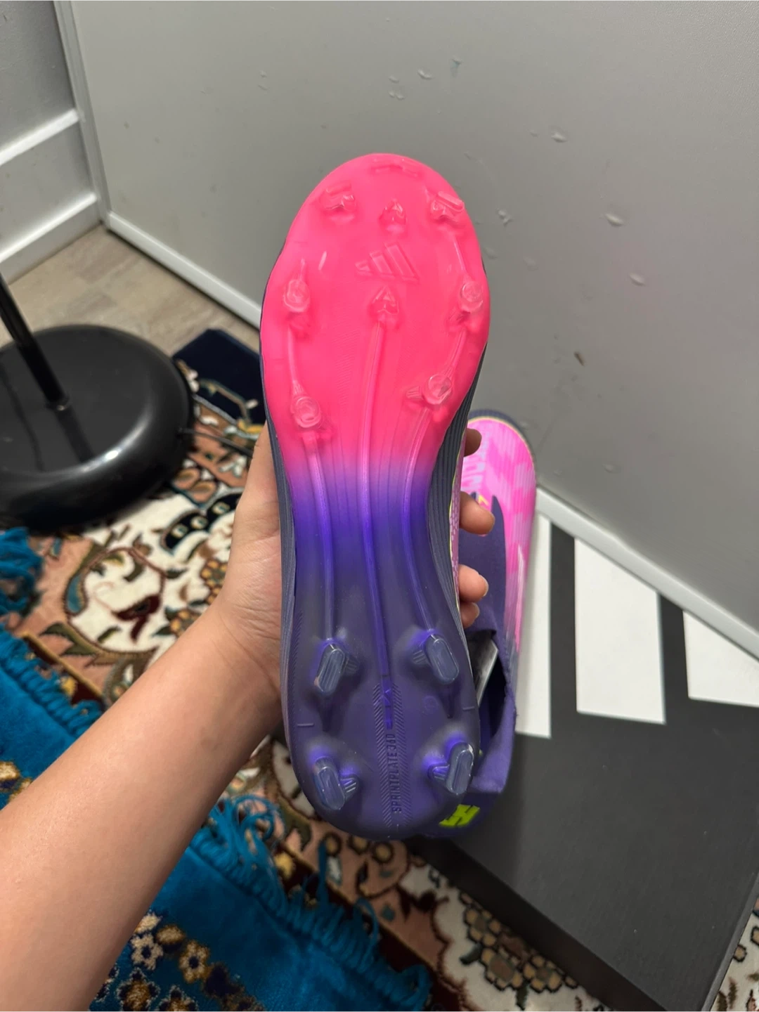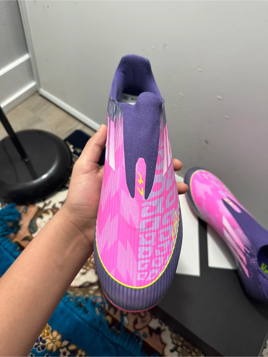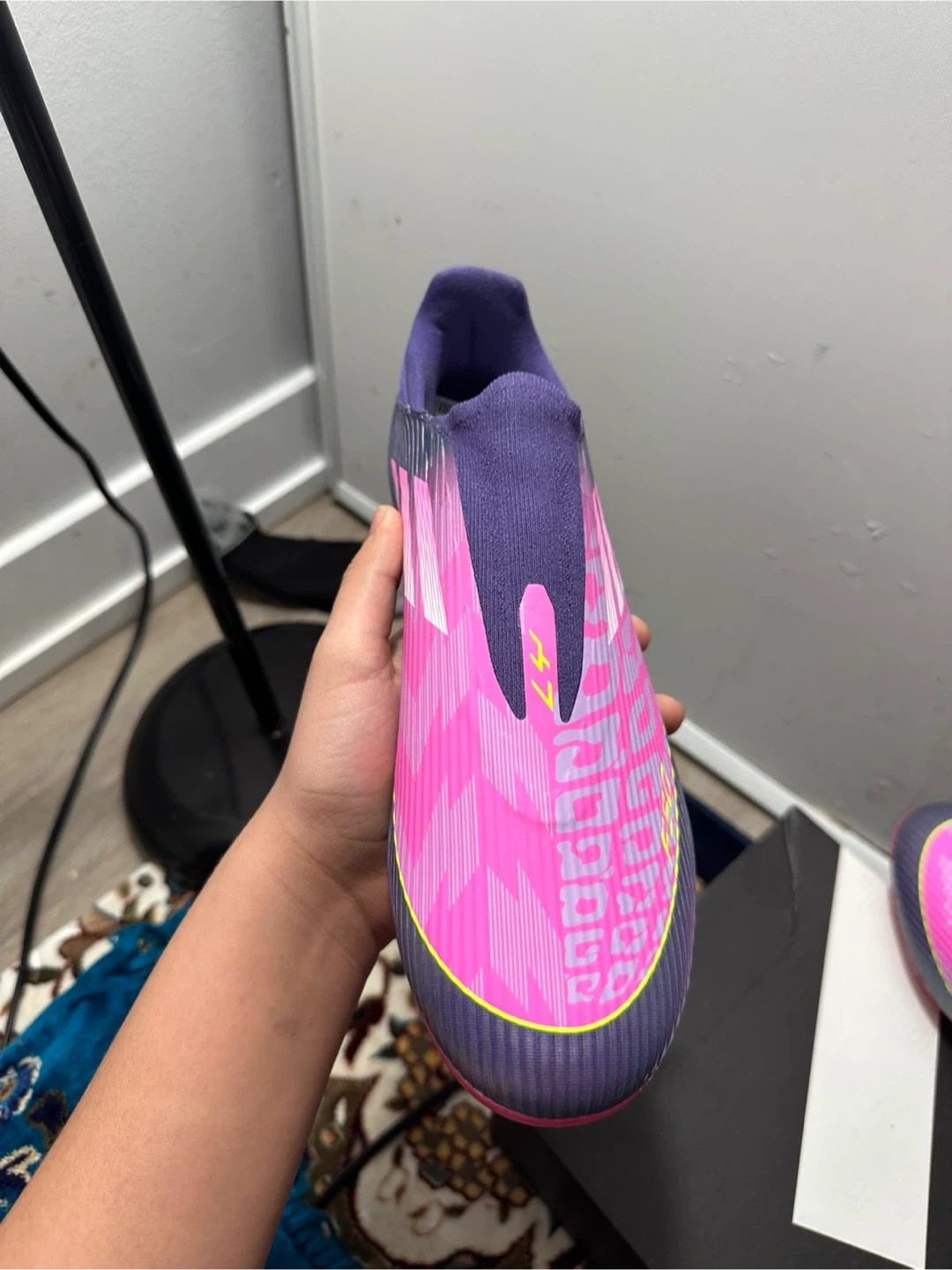 Adidas X Speedflow.1 football cleats in a size 10. These are laceless with a vibrant pink and purple gradient design. They're built for speed and agility on the pitch!