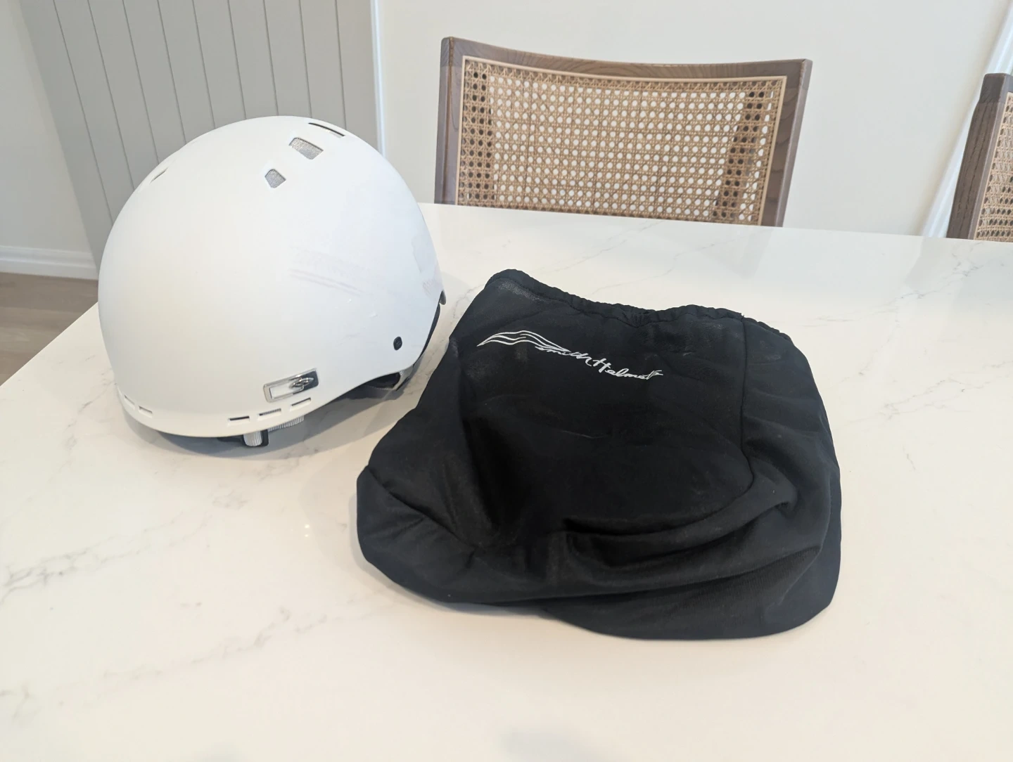 Selling a Smith Holt snow helmet in white. It's in good condition and comes with a black carrying bag. Perfect for hitting the slopes this winter!