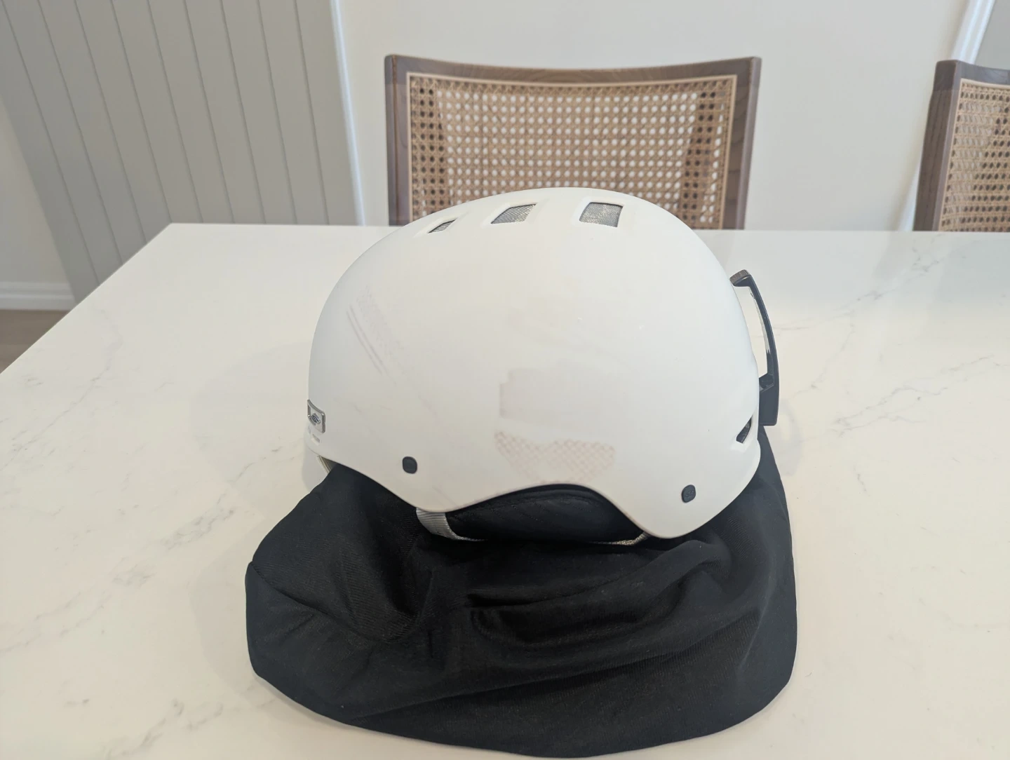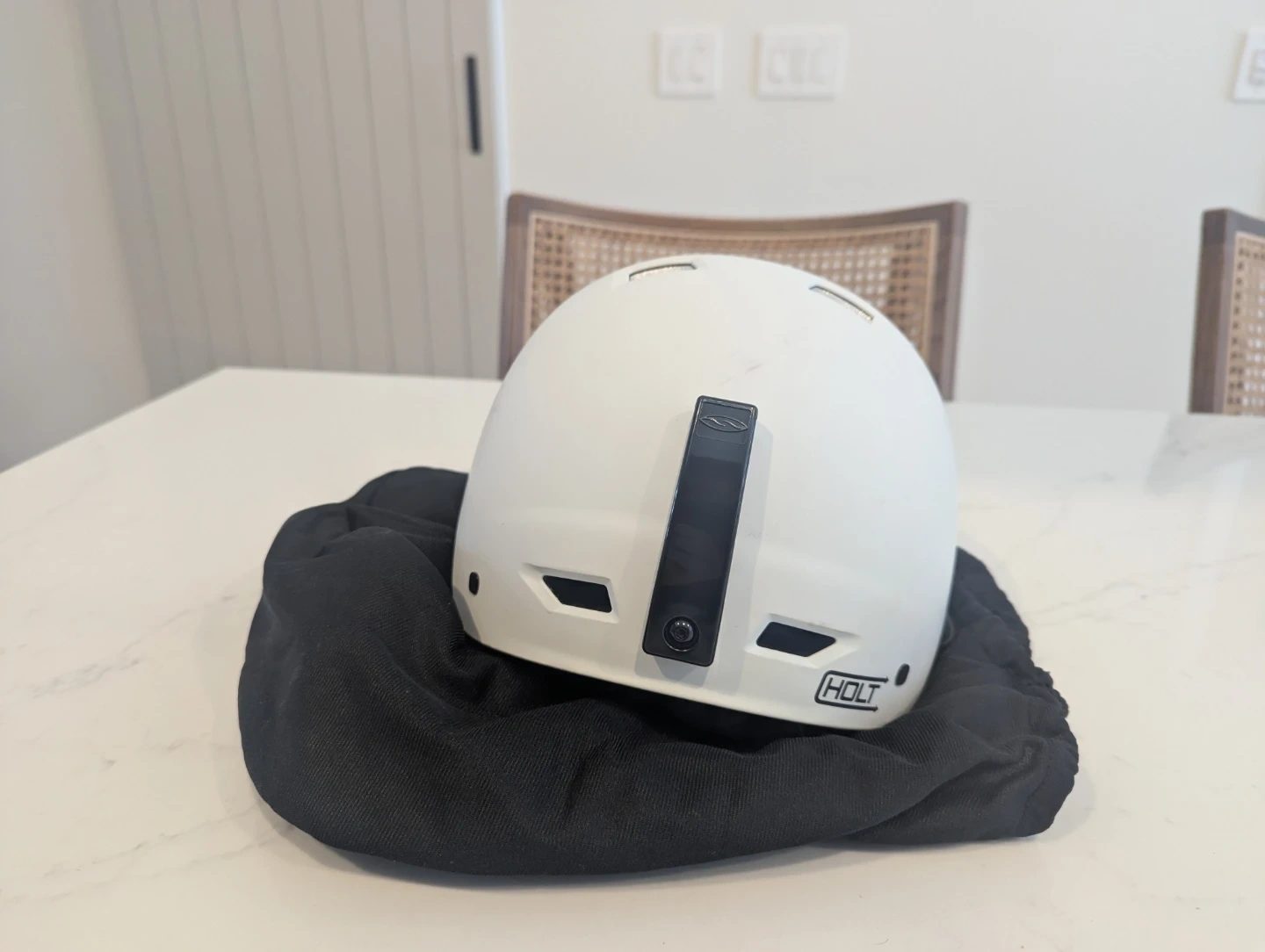 Selling a Smith Holt snow helmet in white. It's in good condition and comes with a black carrying bag. Perfect for hitting the slopes this winter!