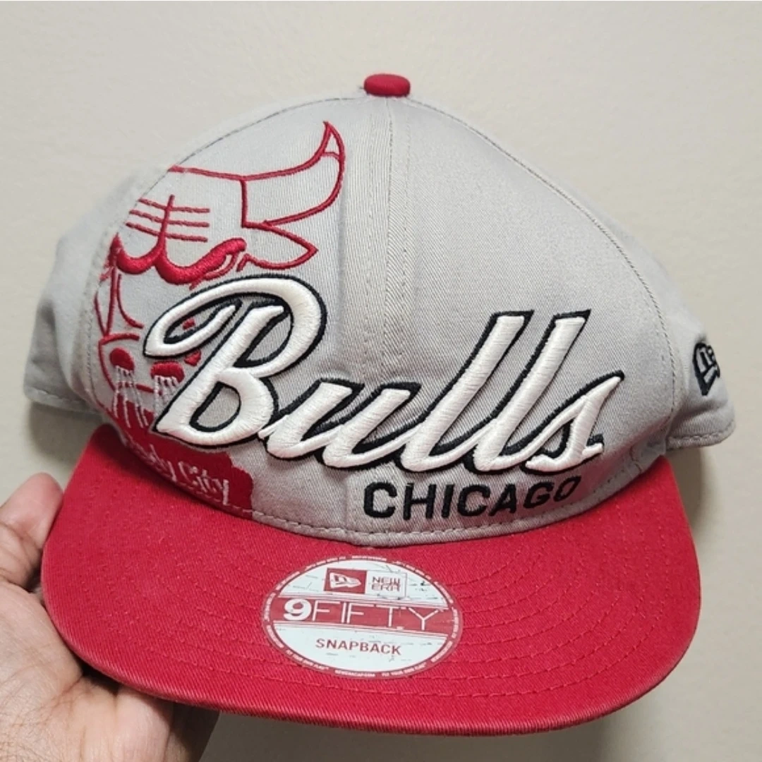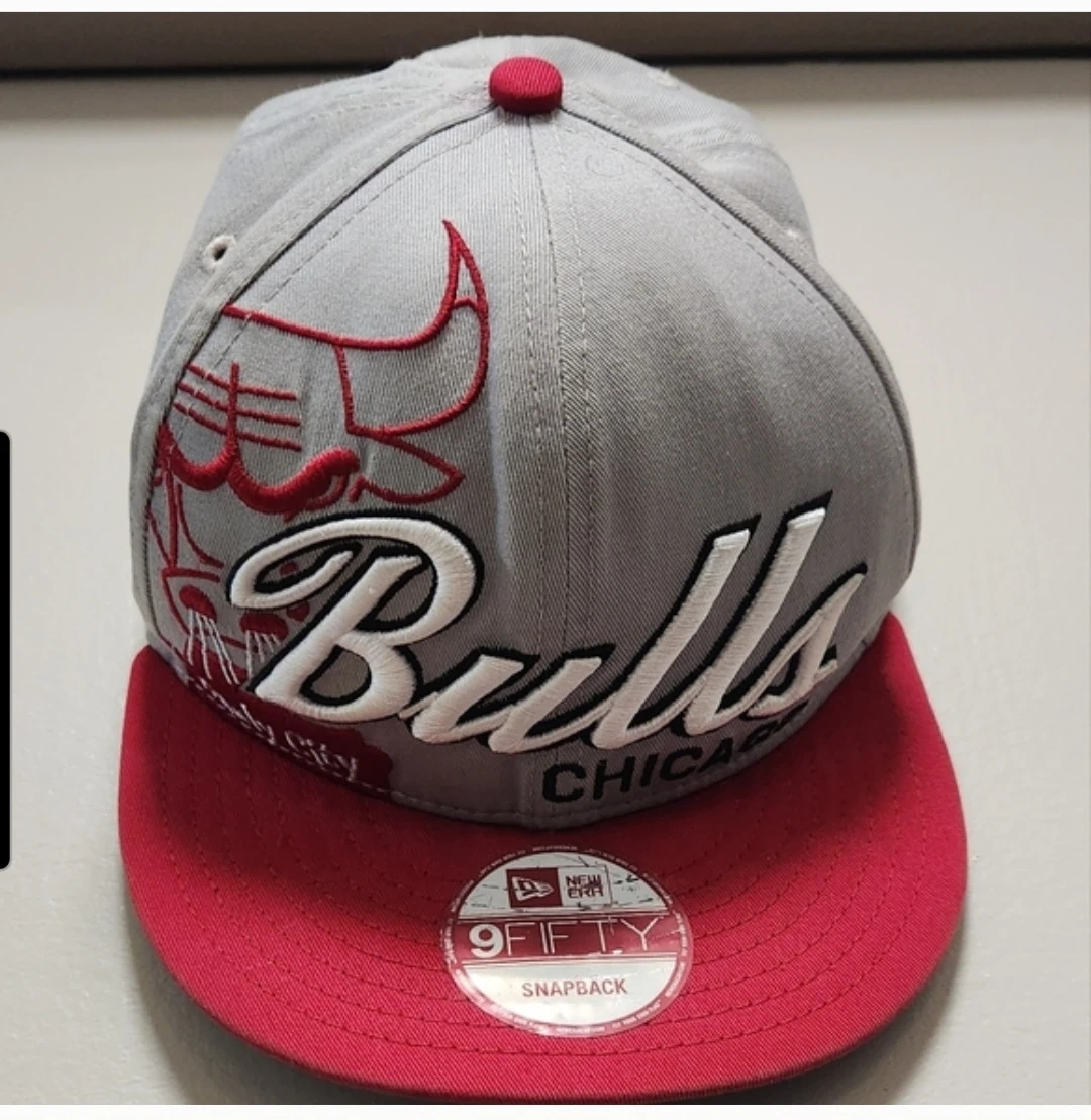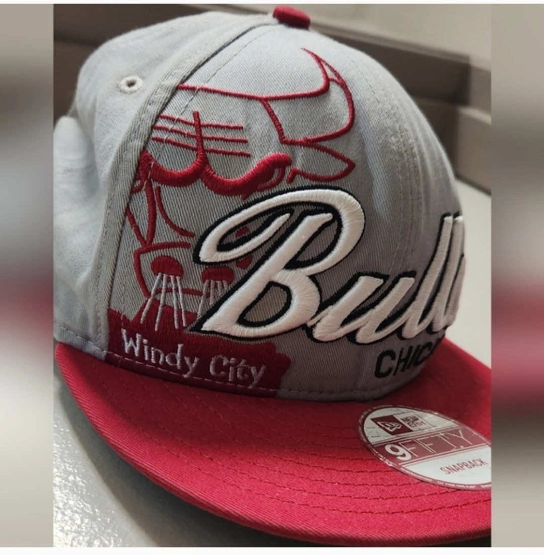 This is a Vintage New Era 9FIFTY snapback hat featuring the Chicago Bulls logo. It's gray with a red brim and includes 'Windy City' embroidery. This cap is adjustable for a comfortable fit.