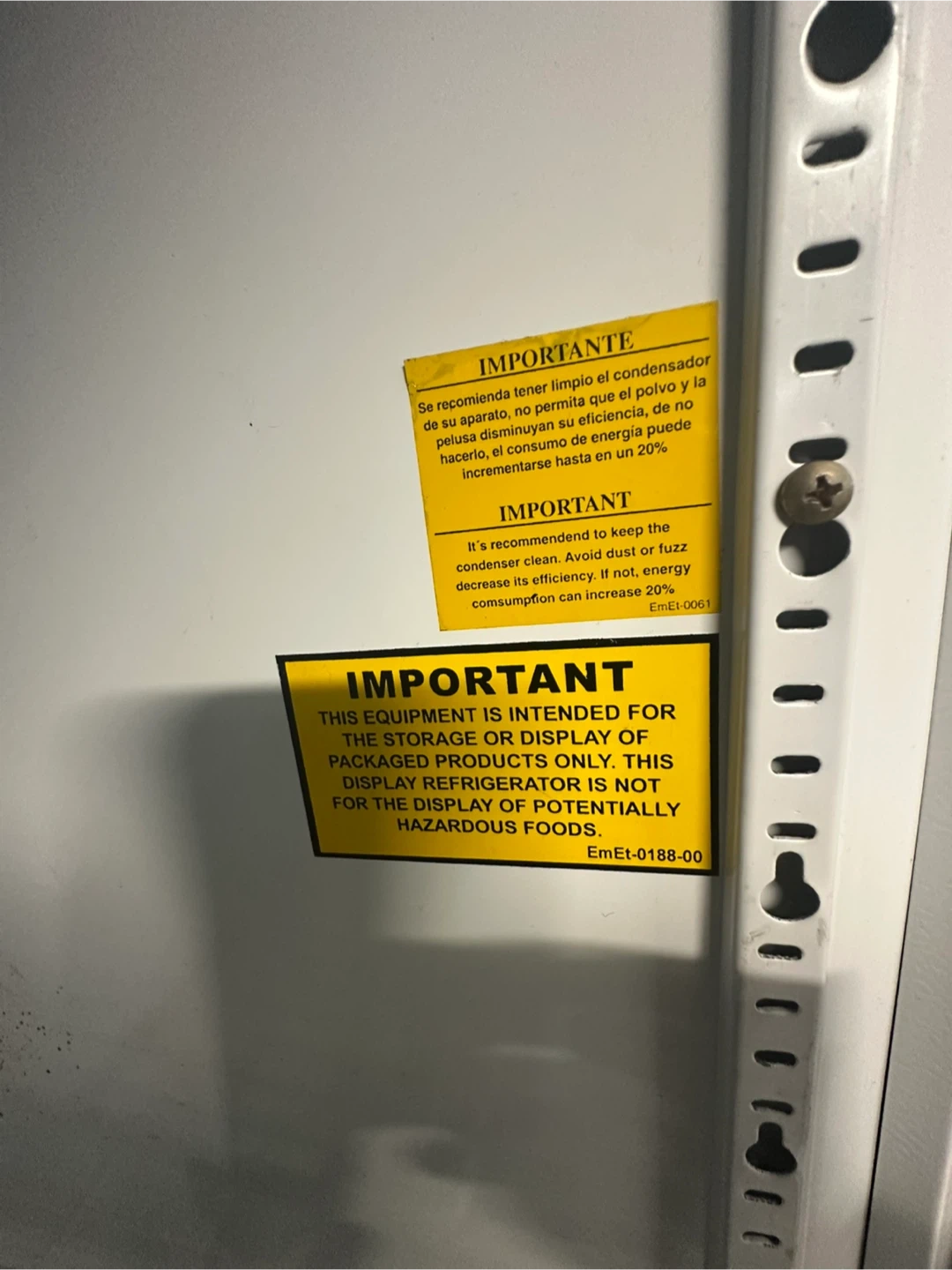 This is a Tor Rey commercial double-door display refrigerator. It's perfect for keeping beverages and other items chilled and visible for customers. Features multiple wire shelves for ample storage.