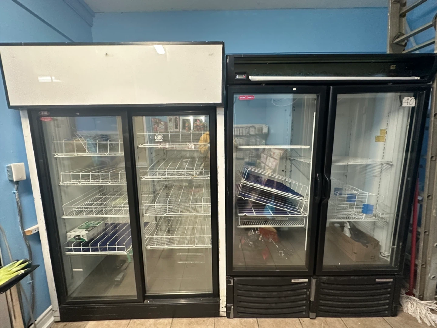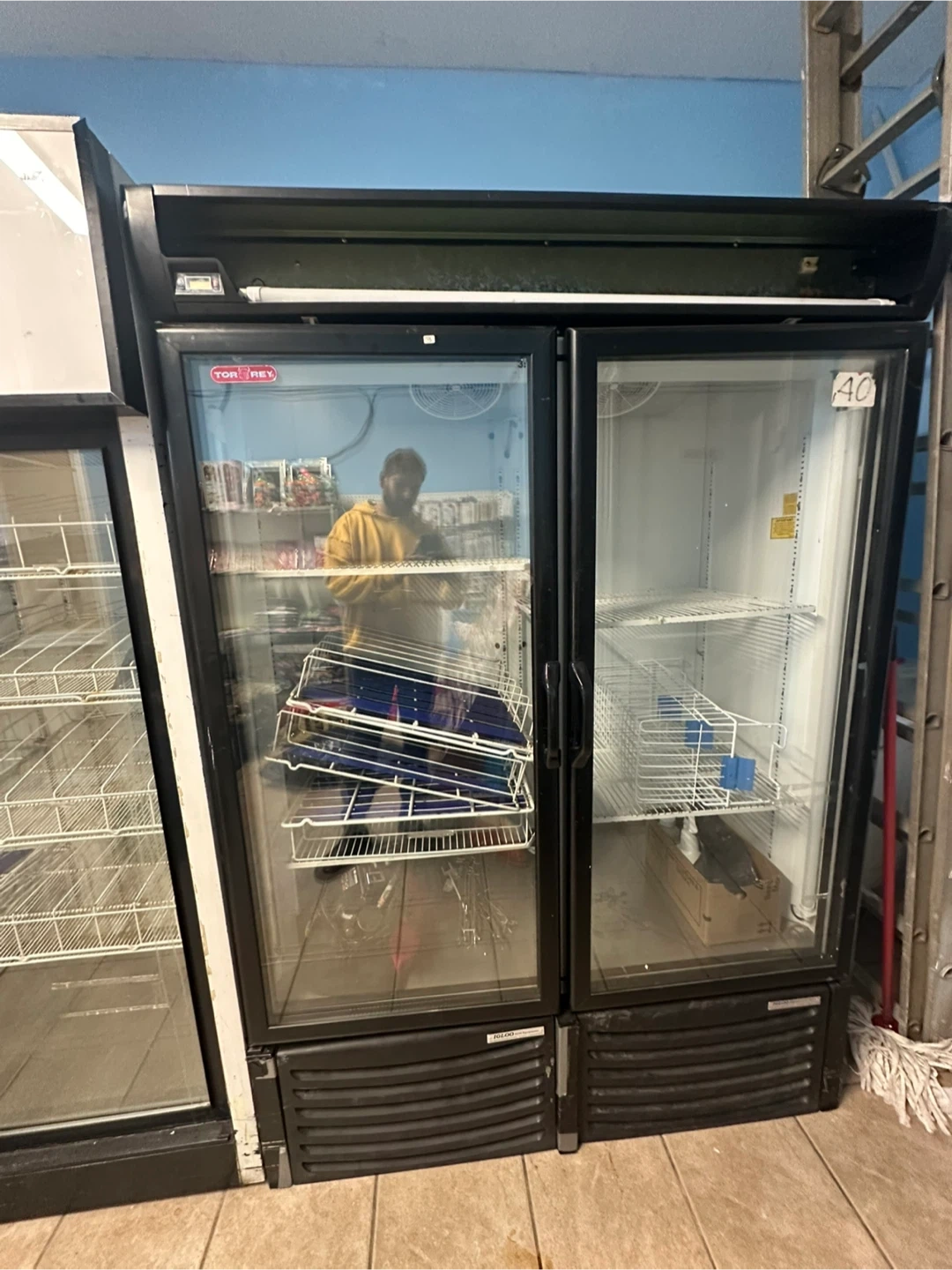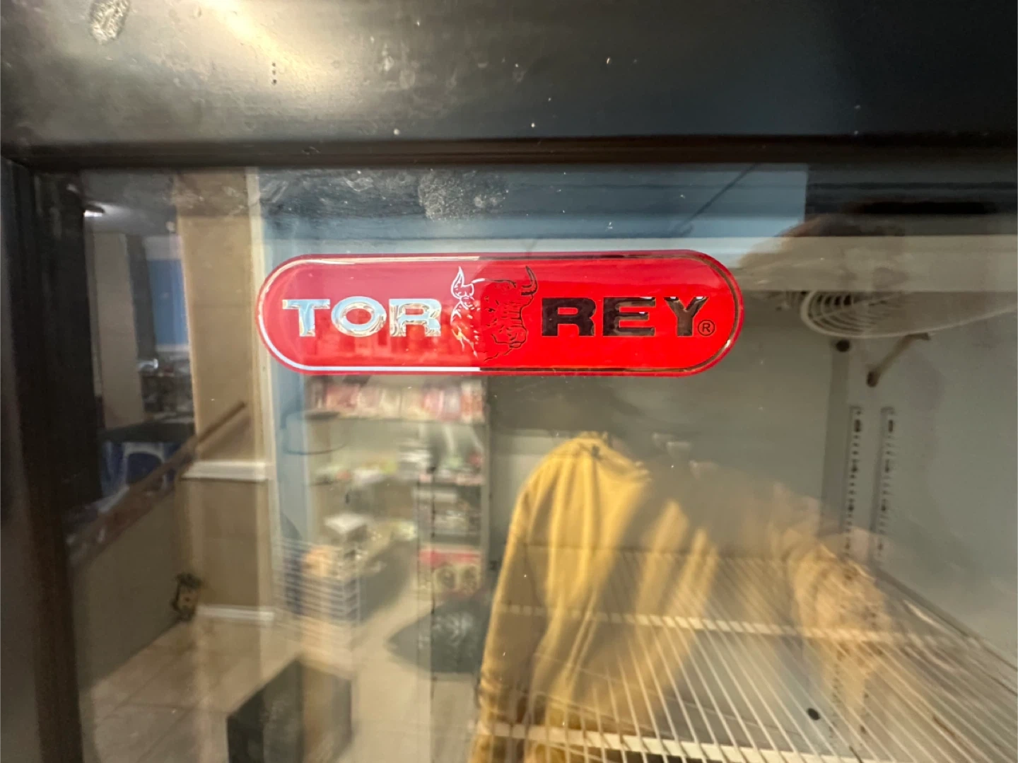 This is a Tor Rey commercial double-door display refrigerator. It's perfect for keeping beverages and other items chilled and visible for customers. Features multiple wire shelves for ample storage.