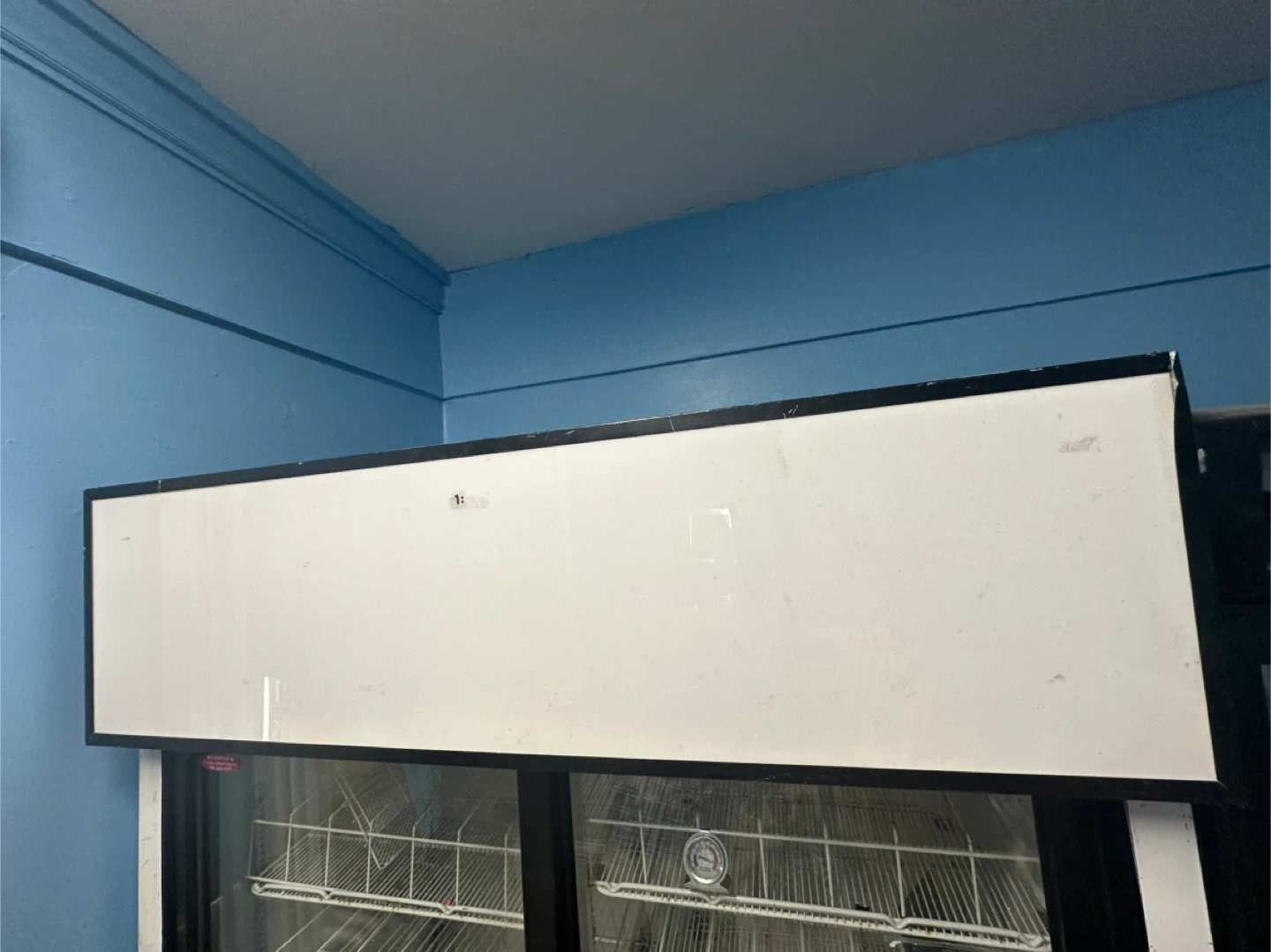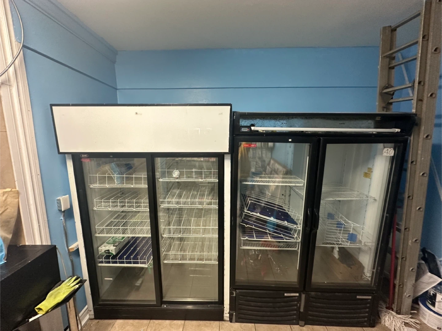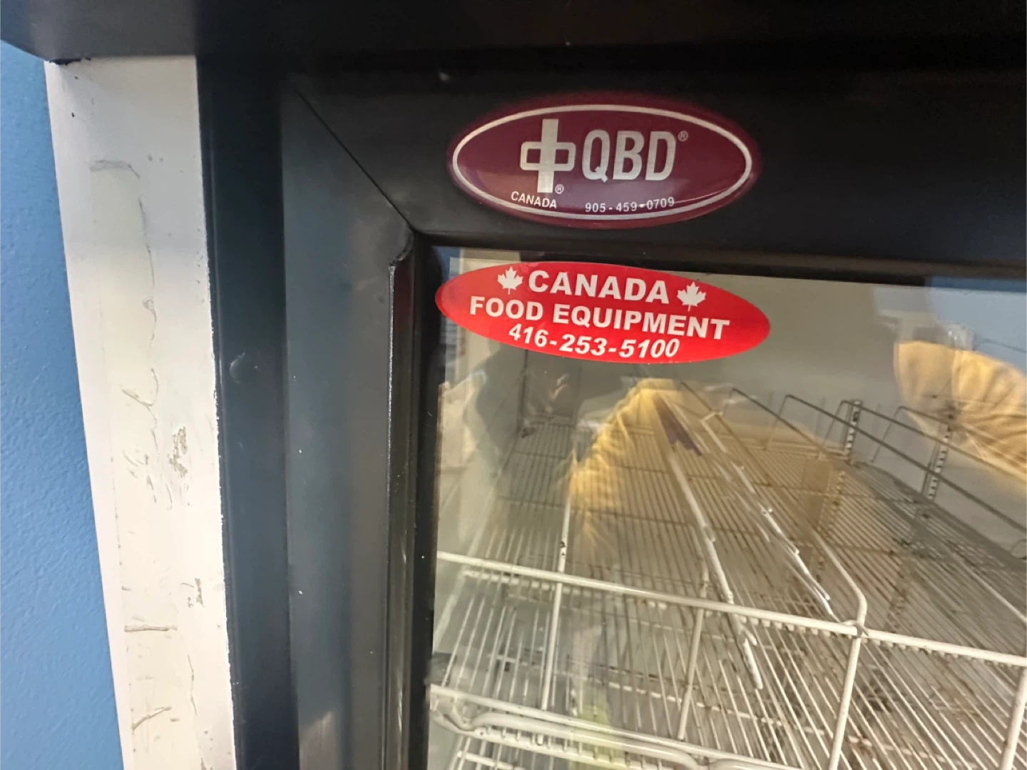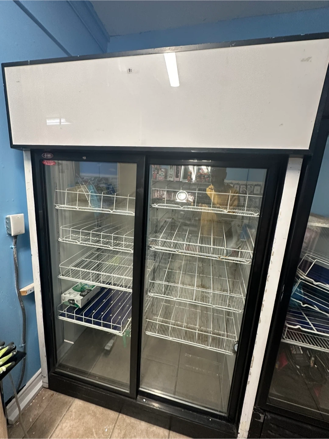 This is a Tor Rey commercial double-door display refrigerator. It's perfect for keeping beverages and other items chilled and visible for customers. Features multiple wire shelves for ample storage.