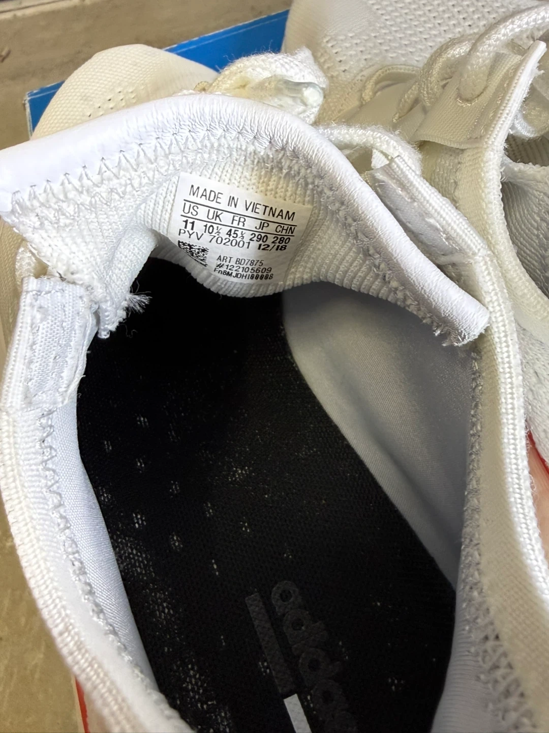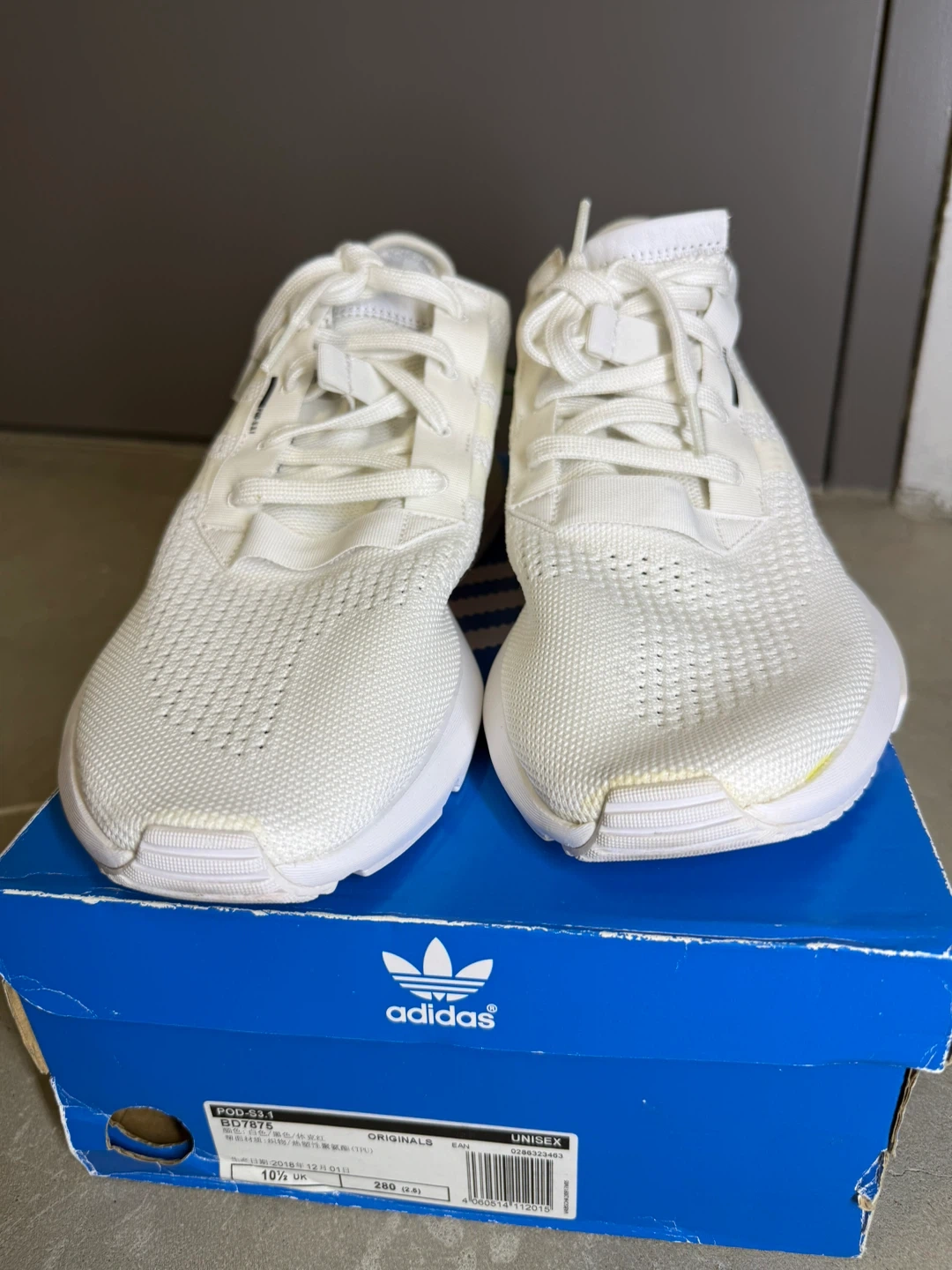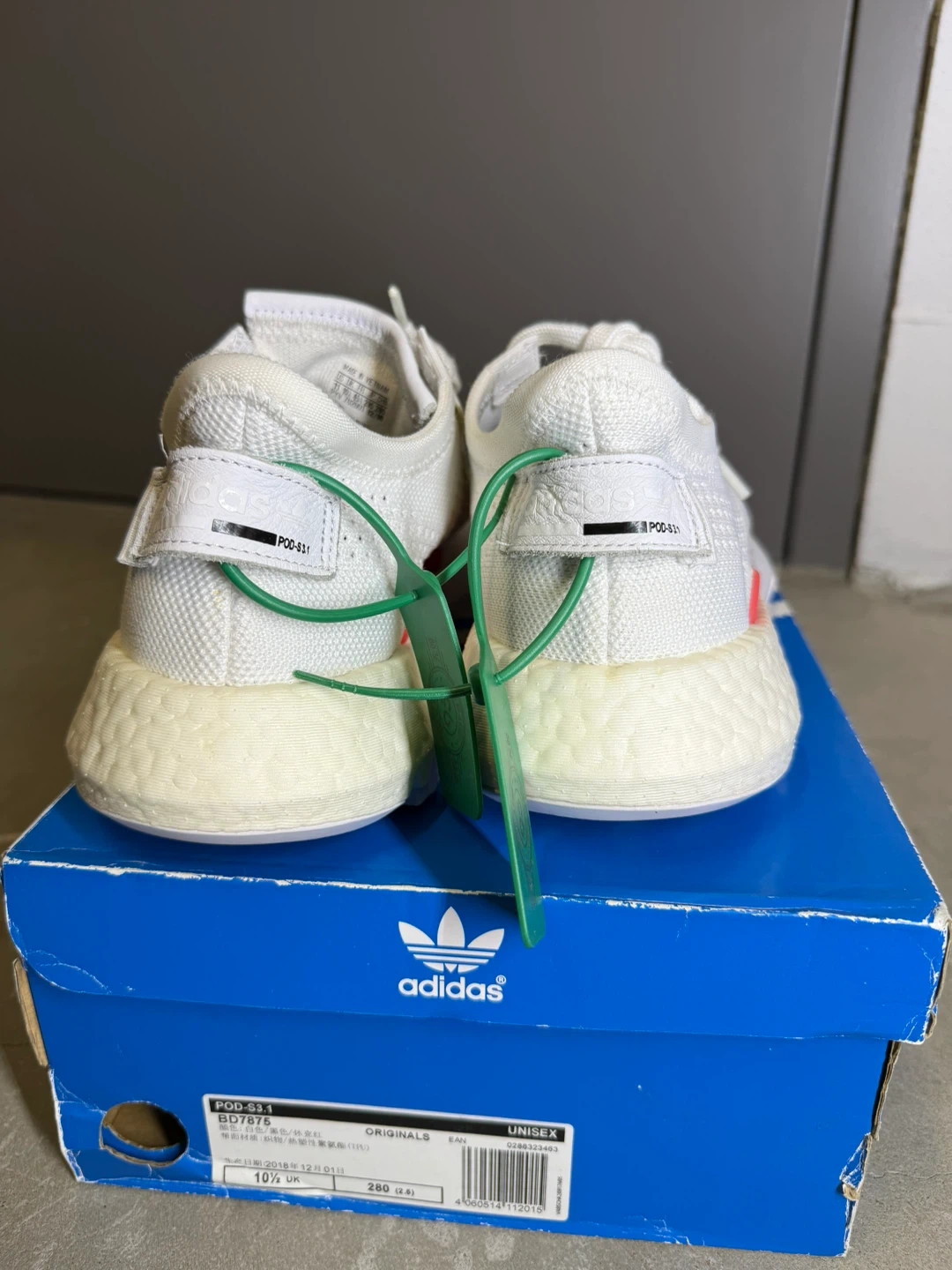 White Adidas POD-S3.1 unisex sneakers in a size 11 US.These shoes include the original box. They're made with a knit upper and feature a unique sole design. Cleaned.