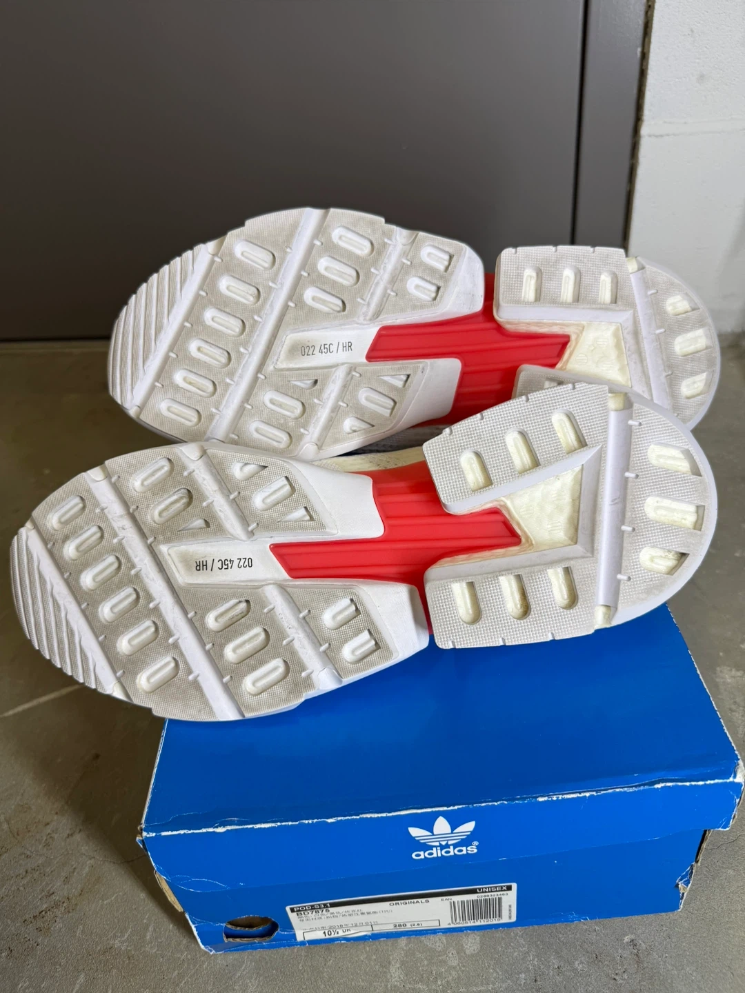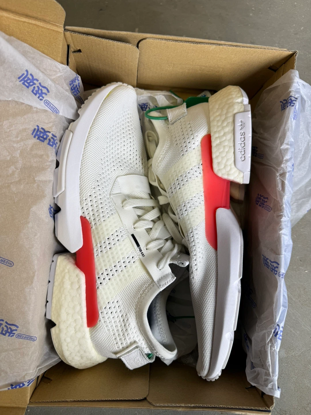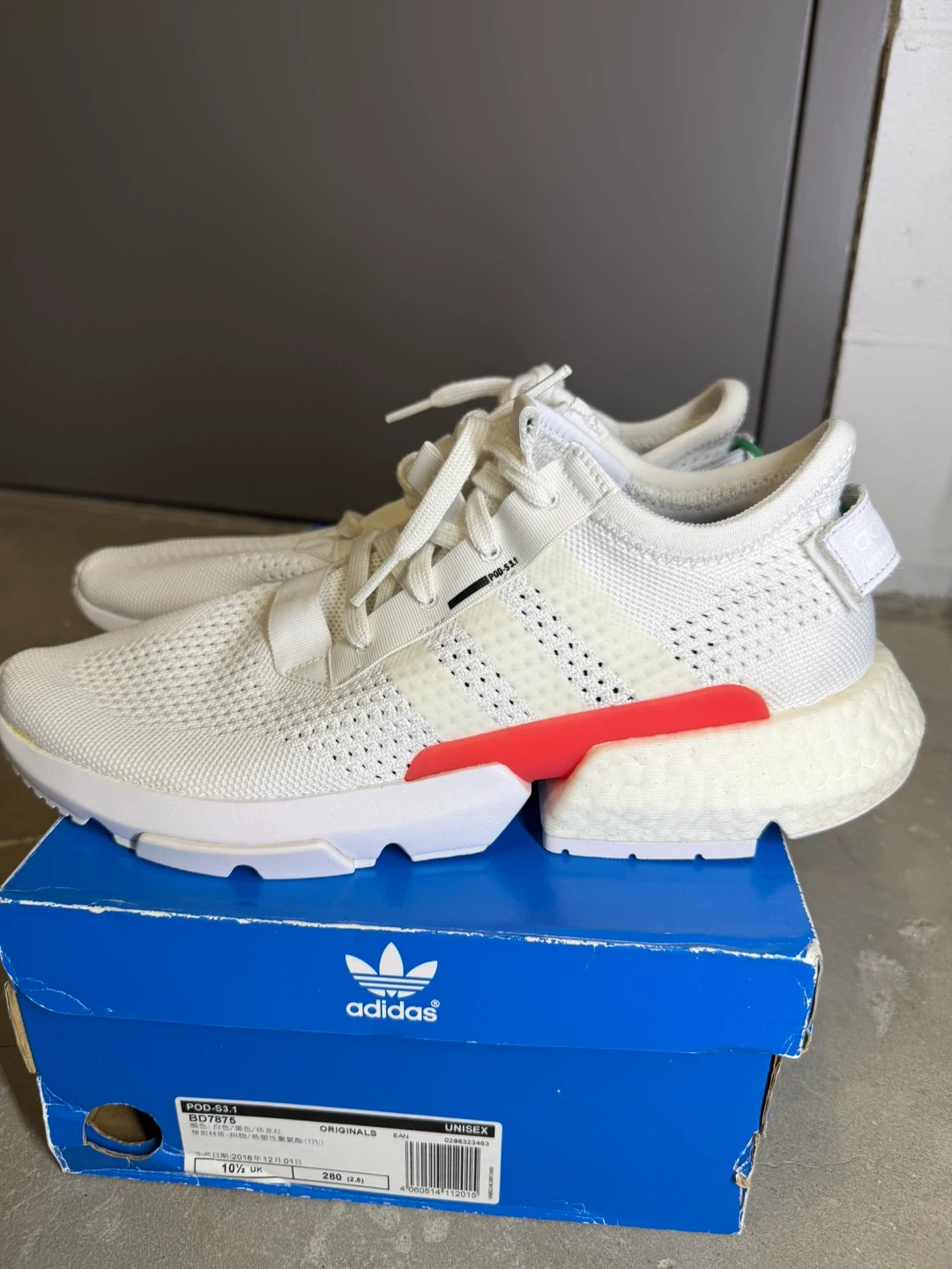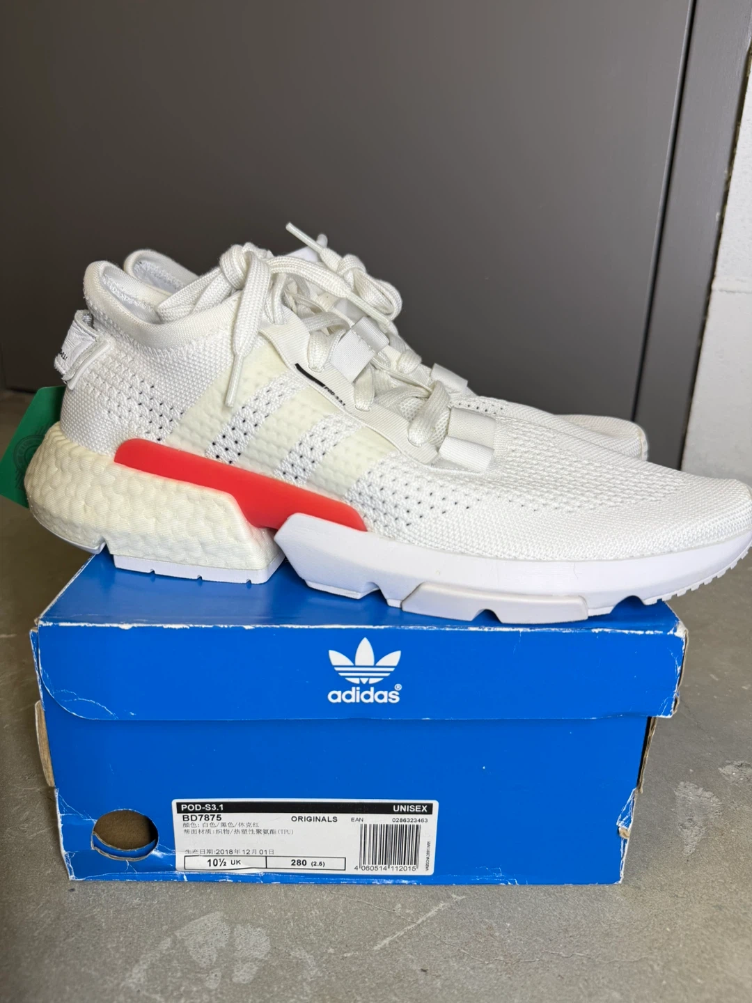 White Adidas POD-S3.1 unisex sneakers in a size 11 US.These shoes include the original box. They're made with a knit upper and feature a unique sole design. Cleaned.