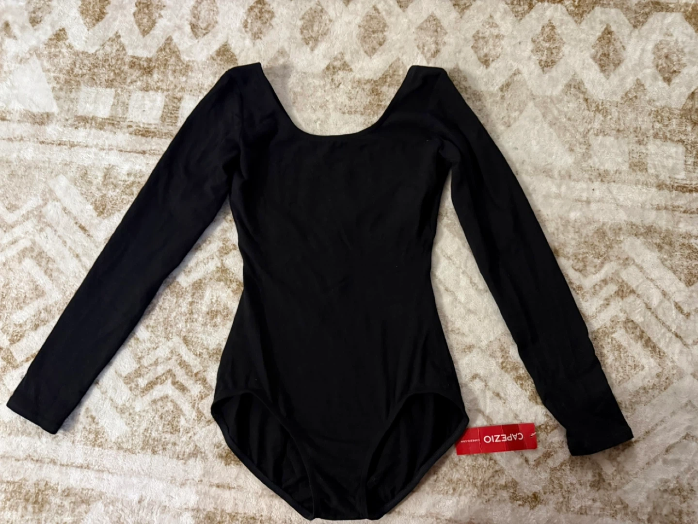 A black long-sleeve leotard. It's perfect for dance classes and performances. This leotard features a scoop neck and comfortable fit.Size Small