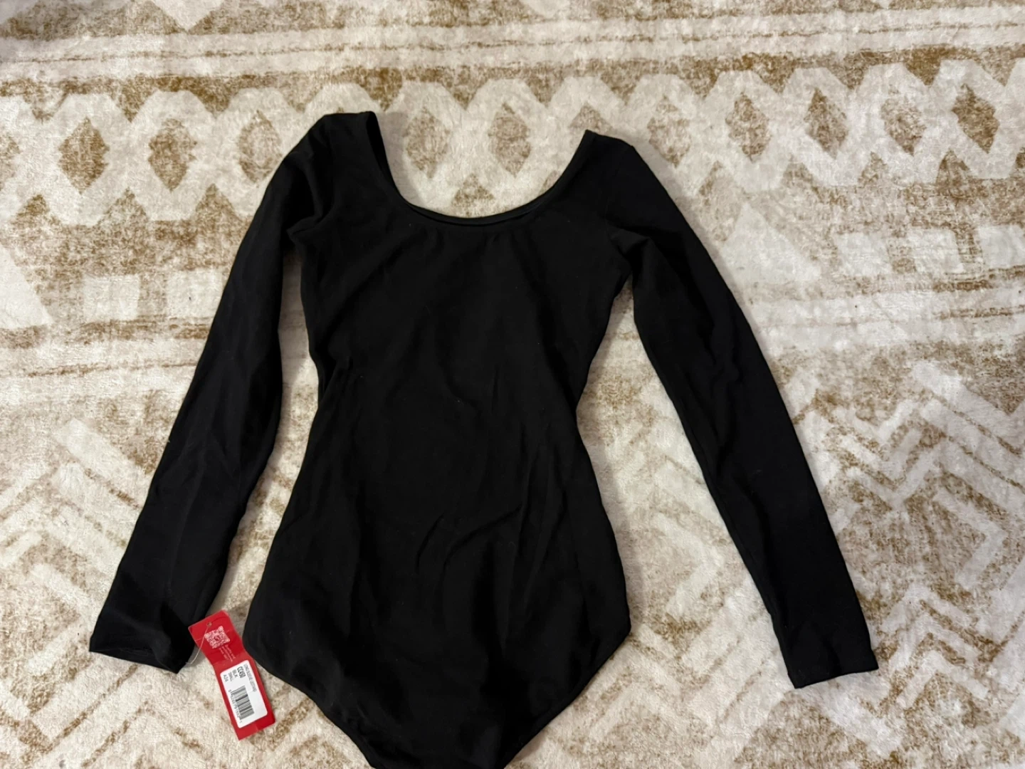 A black long-sleeve leotard. It's perfect for dance classes and performances. This leotard features a scoop neck and comfortable fit.Size Small