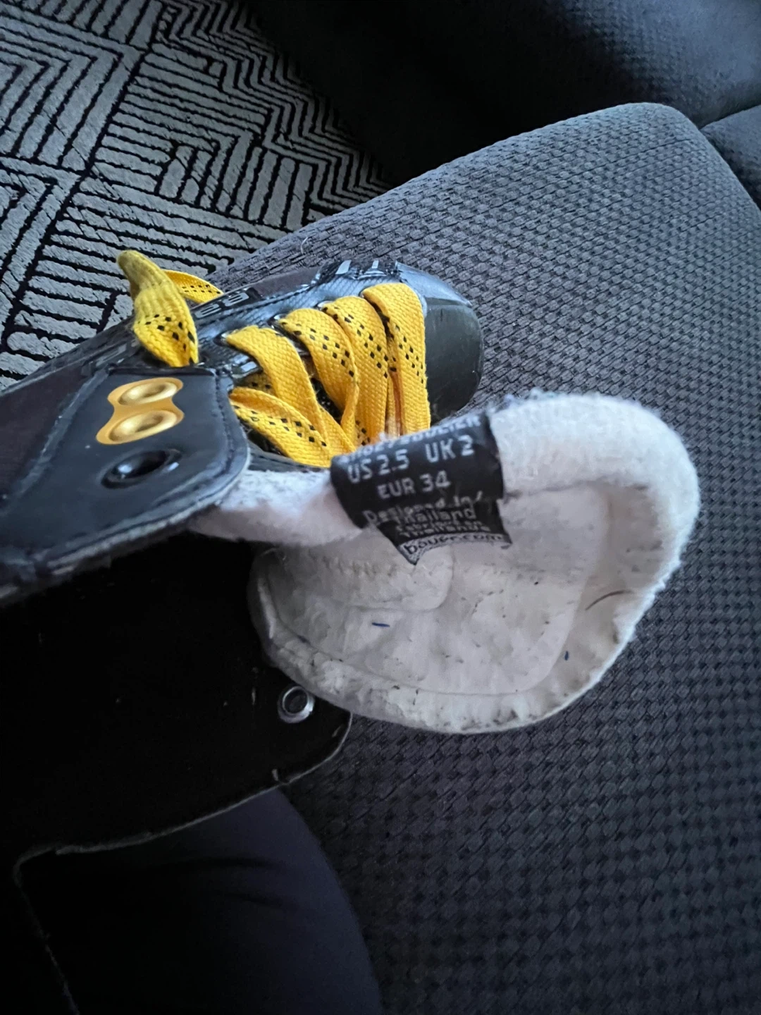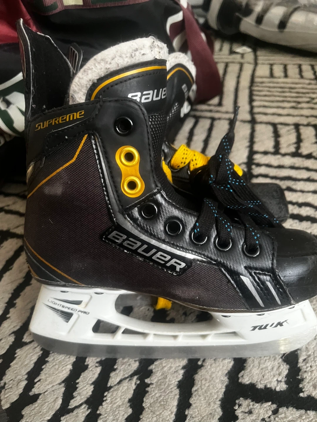 Used Bauer Supreme hockey skates for youth players. These skates are size 1.5 US Youth, EUR 34, UK 2. They feature yellow laces and a black boot with gold accents. Perfect for beginner to intermediate skaters hitting the ice!