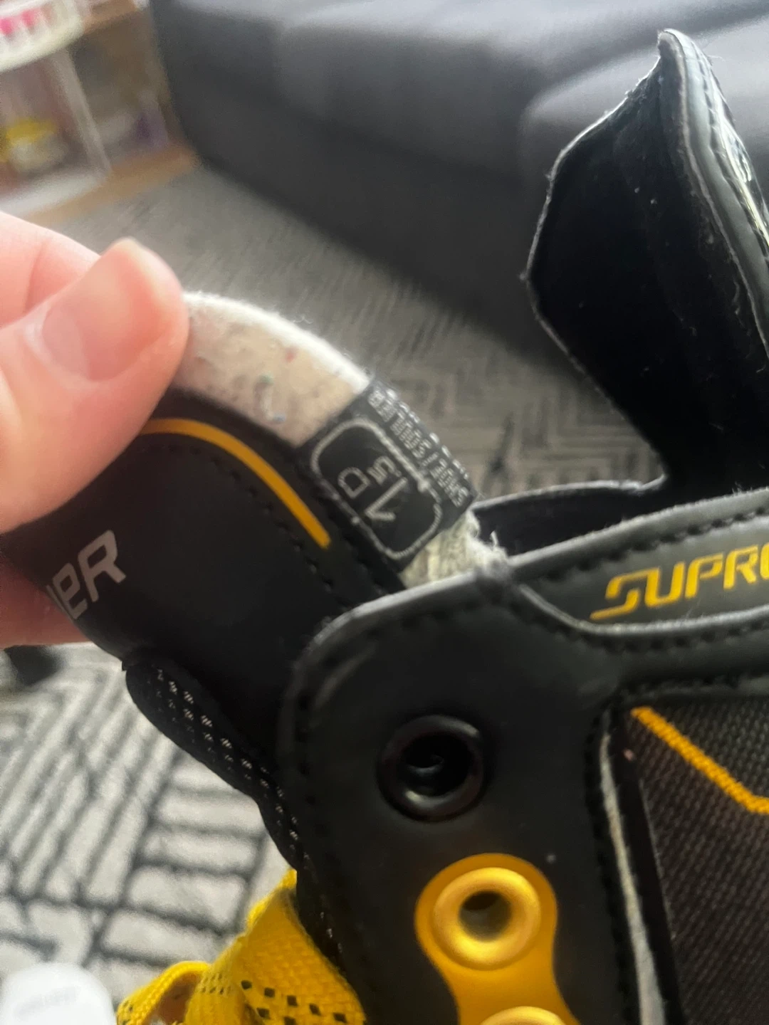 Used Bauer Supreme hockey skates for youth players. These skates are size 1.5 US Youth, EUR 34, UK 2. They feature yellow laces and a black boot with gold accents. Perfect for beginner to intermediate skaters hitting the ice!