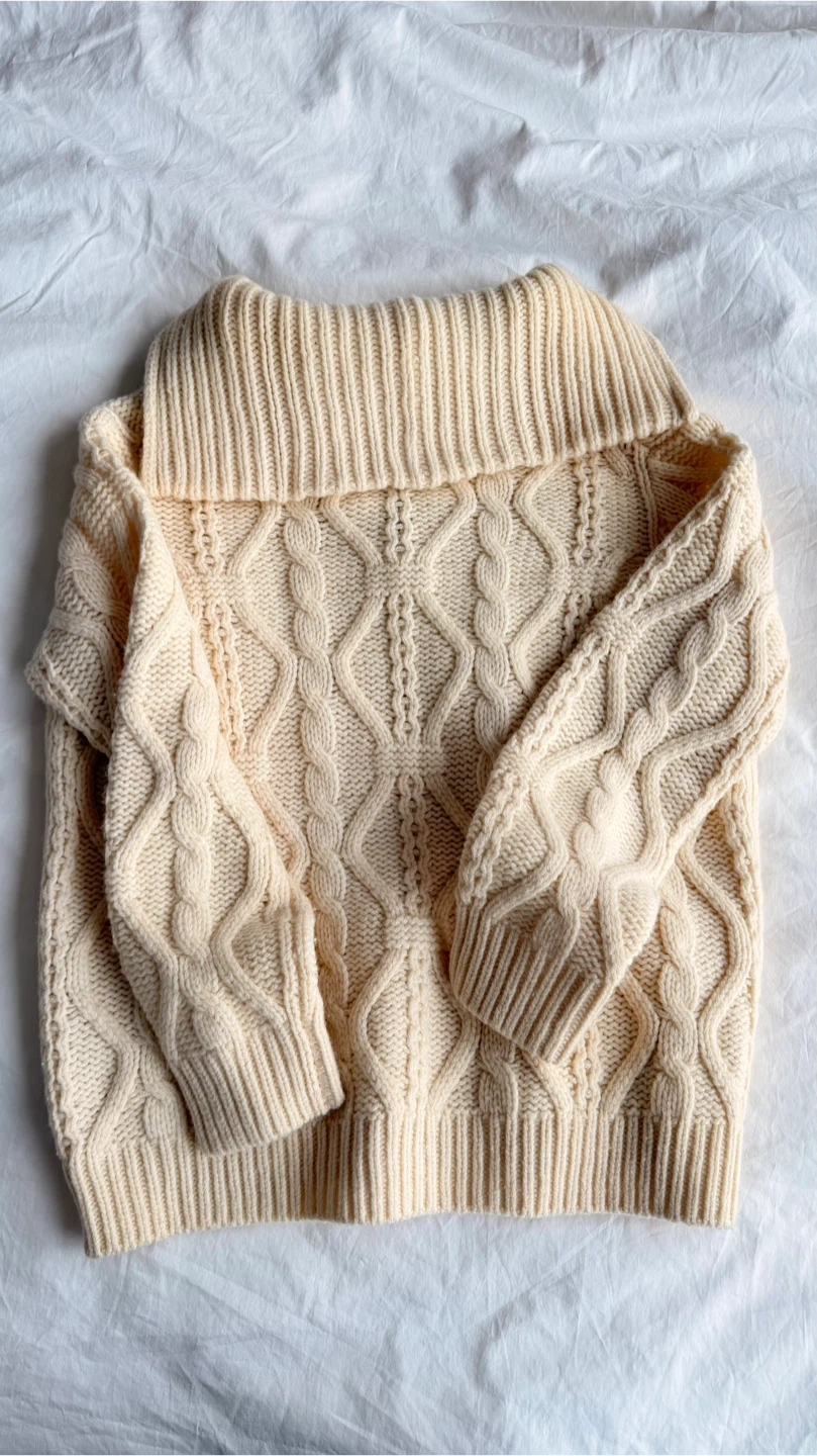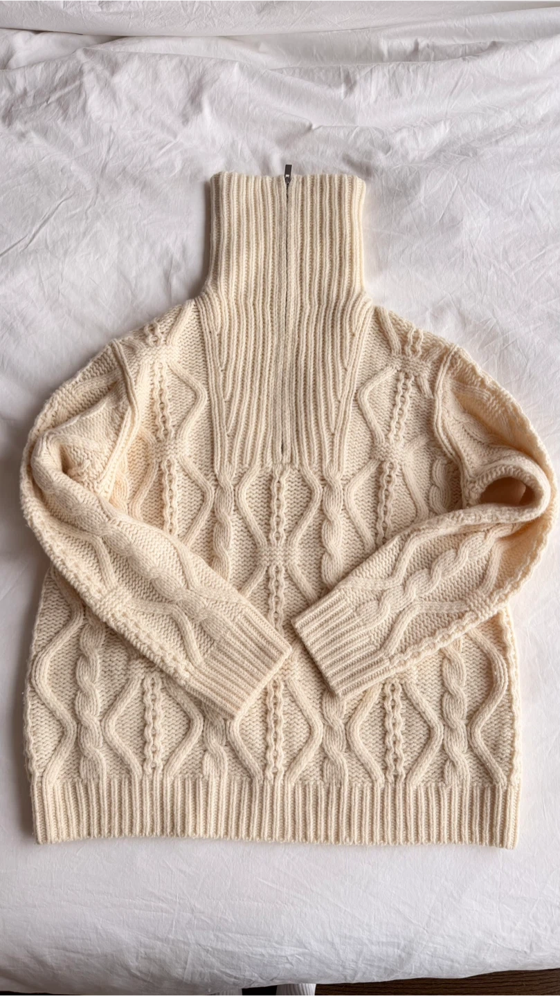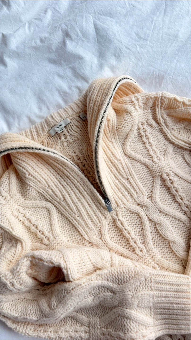 This is a Vince cable knit quarter zip sweater. It's a creamy ivory color with a textured knit pattern. The sweater has a comfortable fit and a stylish design. It's made of a soft material that feels great against the skin. It's suitable for layering or wearing on its own.