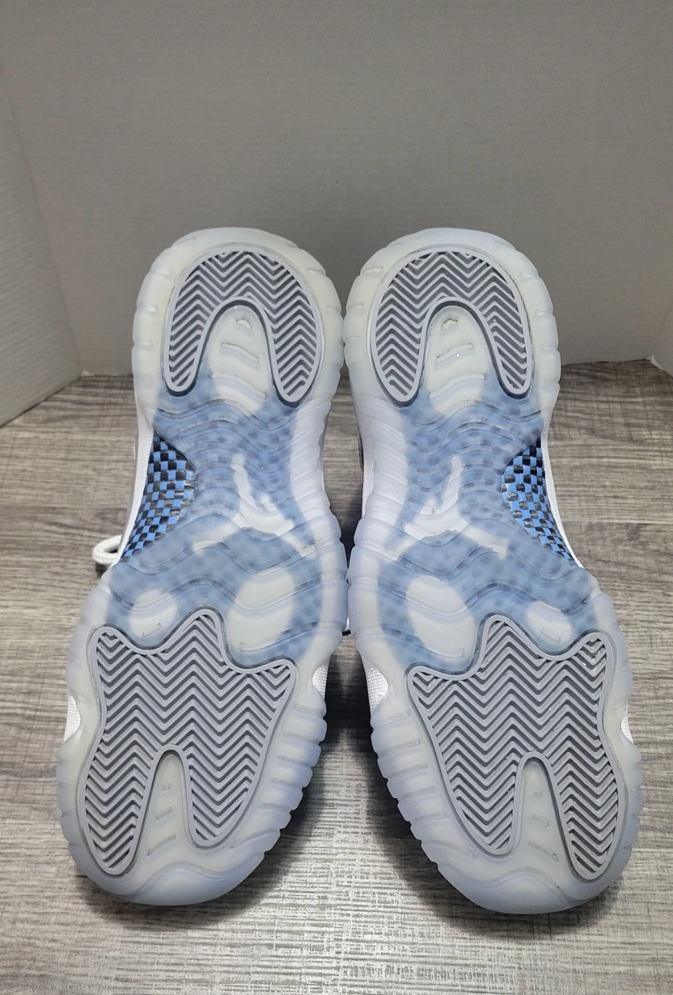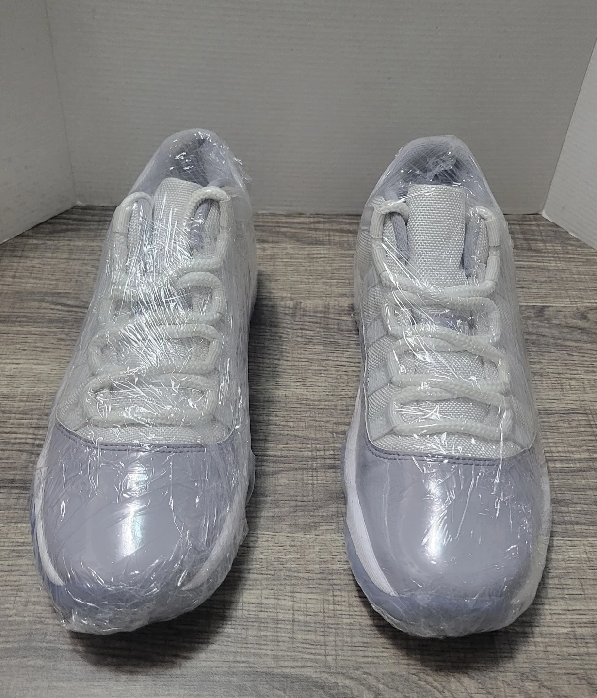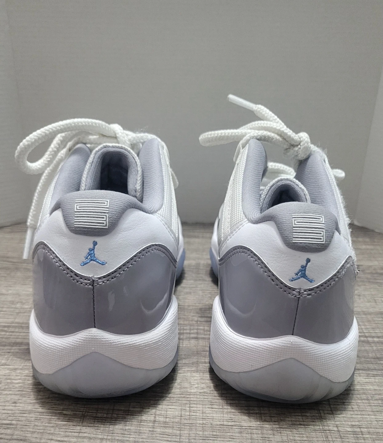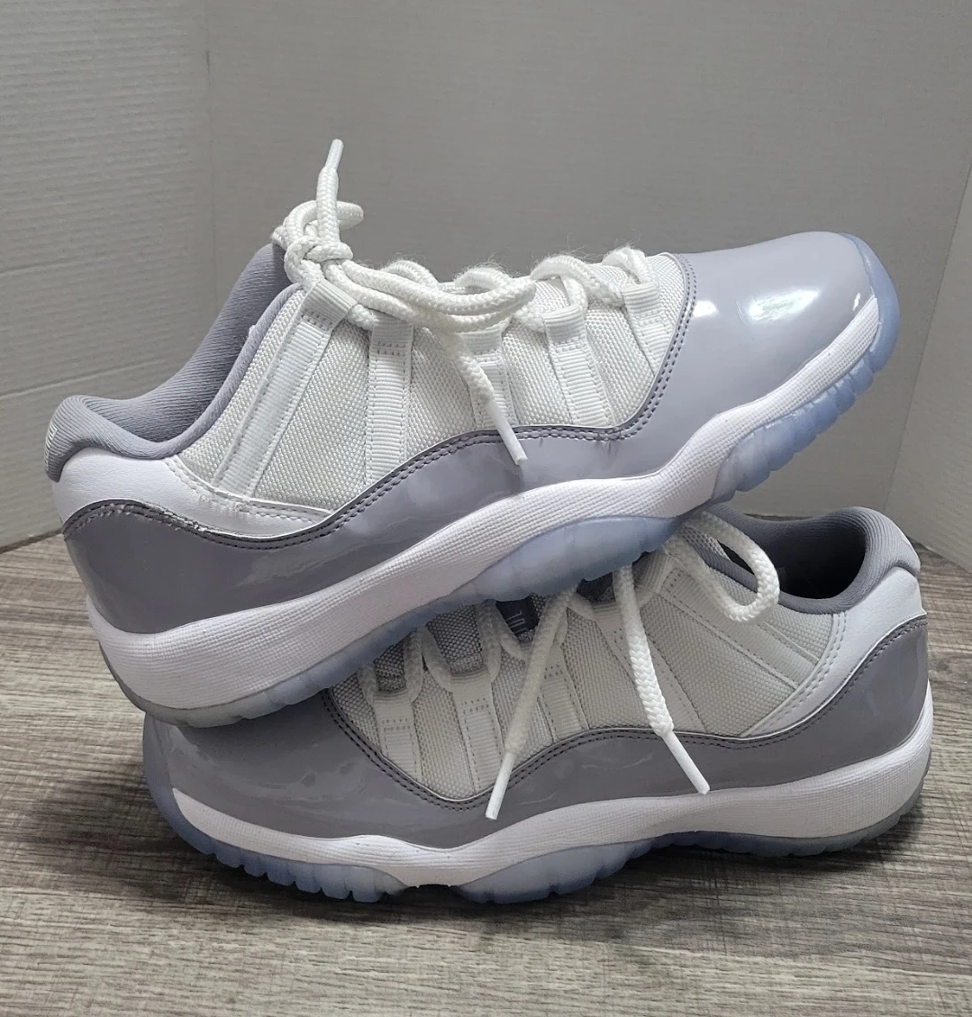 Jordan 11 Retro Low TD sneakers in the "Cement Grey" colorway. Youth size 7Y. These kicks feature a white mesh upper with grey patent leather overlays and translucent icy soles.