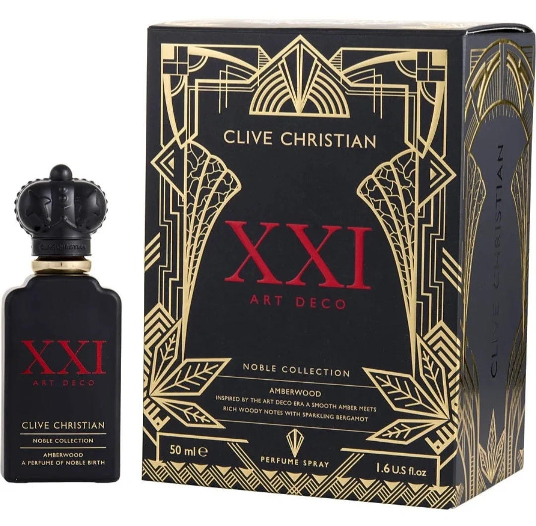 This is the Clive Christian XXI Art Deco Amberwood perfume spray. It's from the Noble Collection and features rich woody notes with sparkling bergamot. The bottle contains 50 ml.