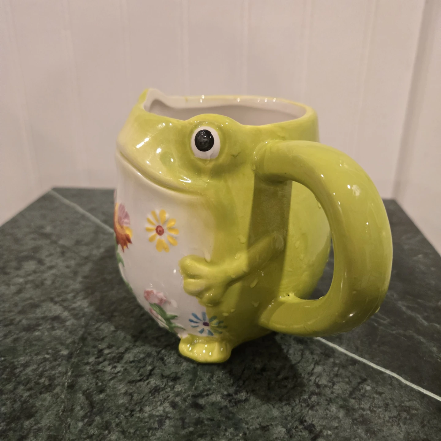 This adorable frog mug is sure to bring a smile to your face! It features a cute frog design with colourful floral accents. Perfect for your morning coffee or tea!