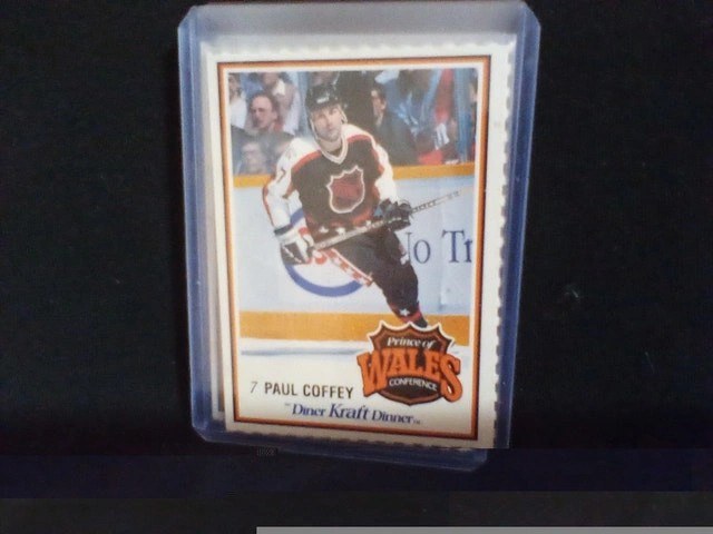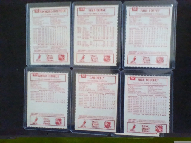 1989/1990 Prince Of Wales Kraft Dinner Hockey Cards set. Includes #52 Ray Bourque, #53 Sean Burke, #54 Paul Coffey, #55 Mario Lemieux, #56 Cam Neely, and #57 Rick Tocchet. All cards are in very good condition and well preserved. Please see pictures for details.