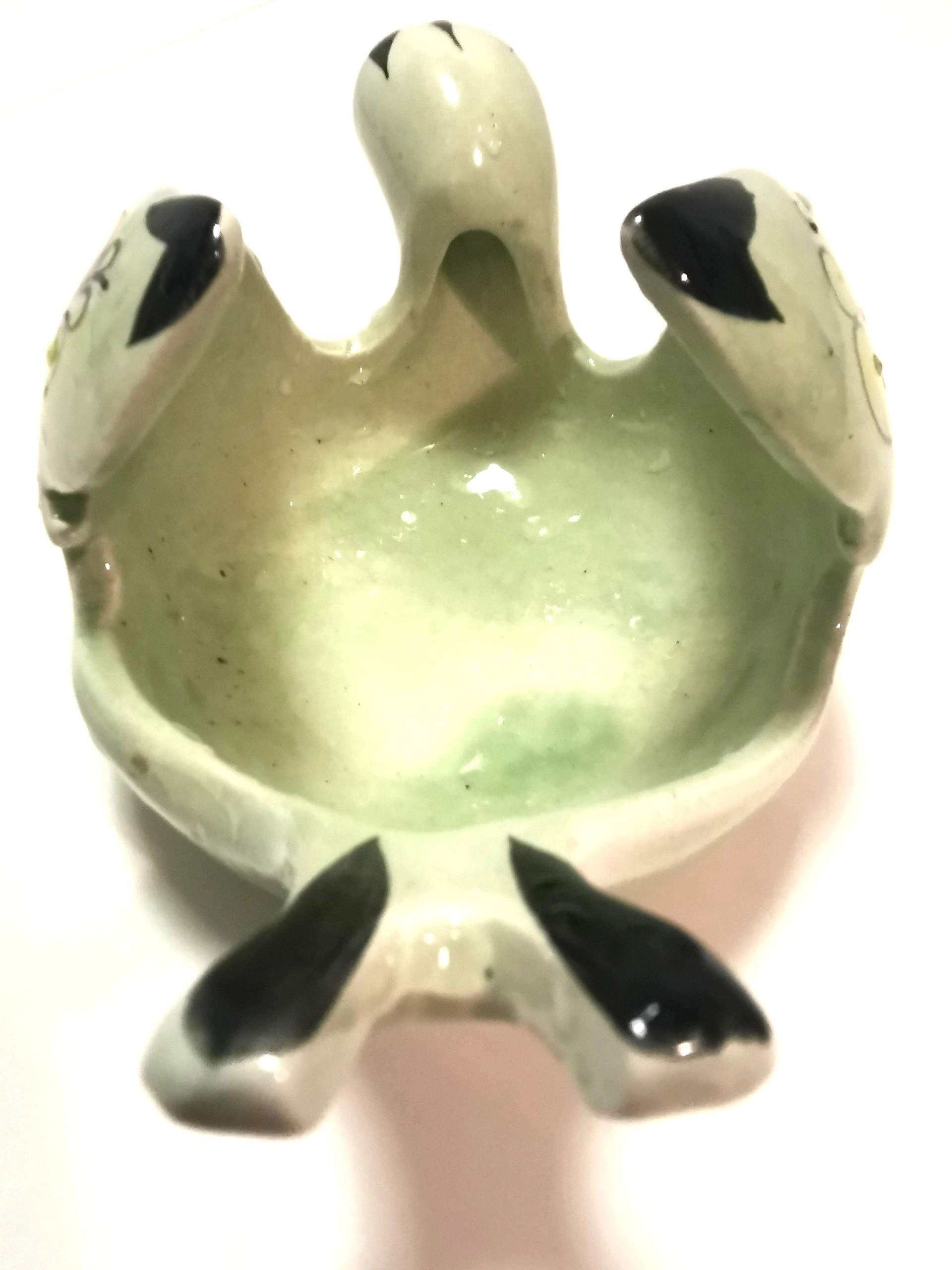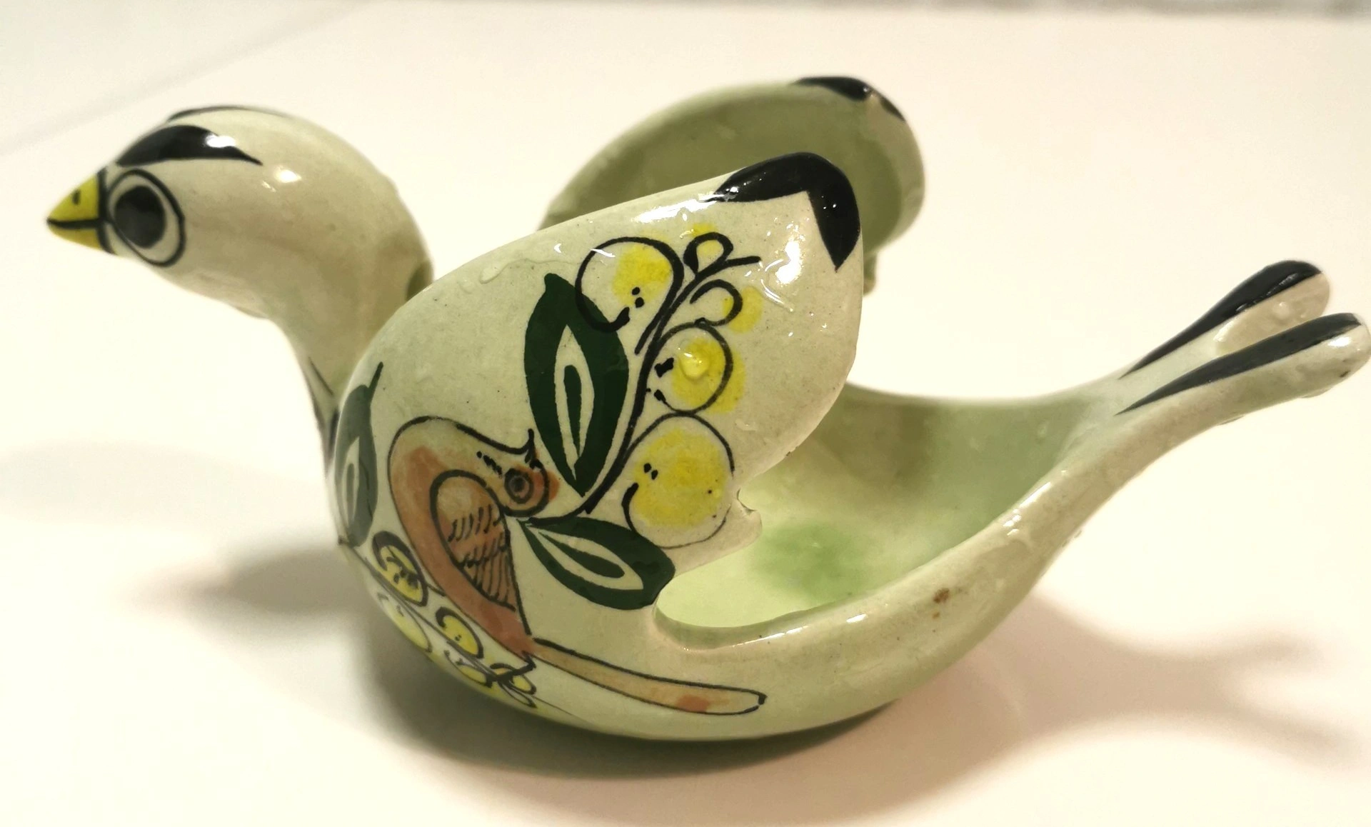 Condition: Good vintage condition light wear. The hand-painted glaze is vibrant and well-preserved. Minor surface wear on the unglazed base is consistent with its age. Please review photos as they are part of the description of the item.