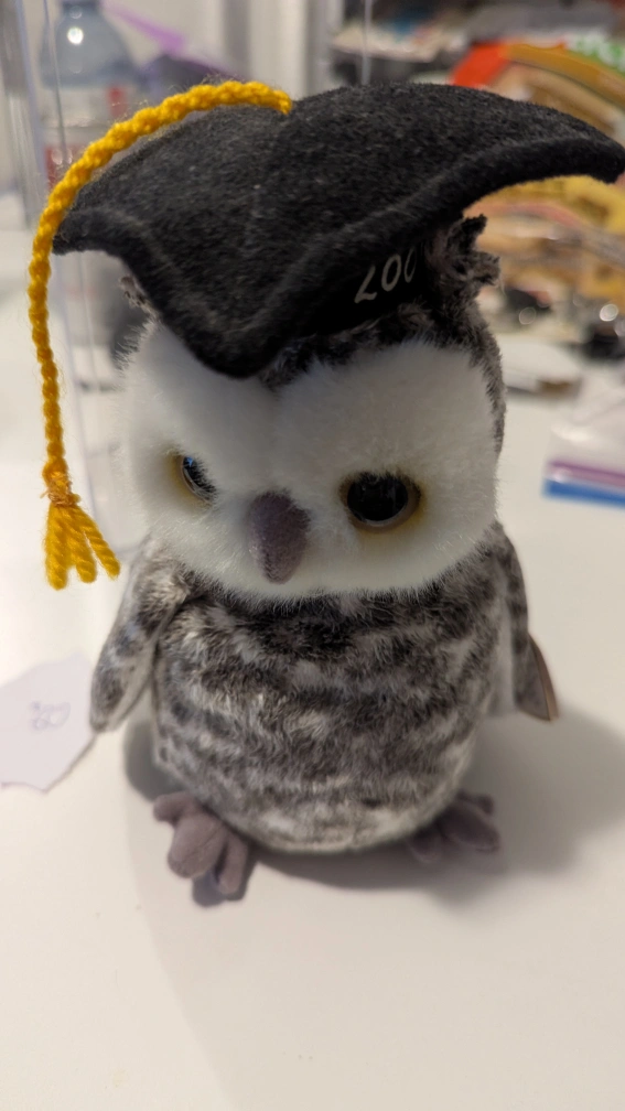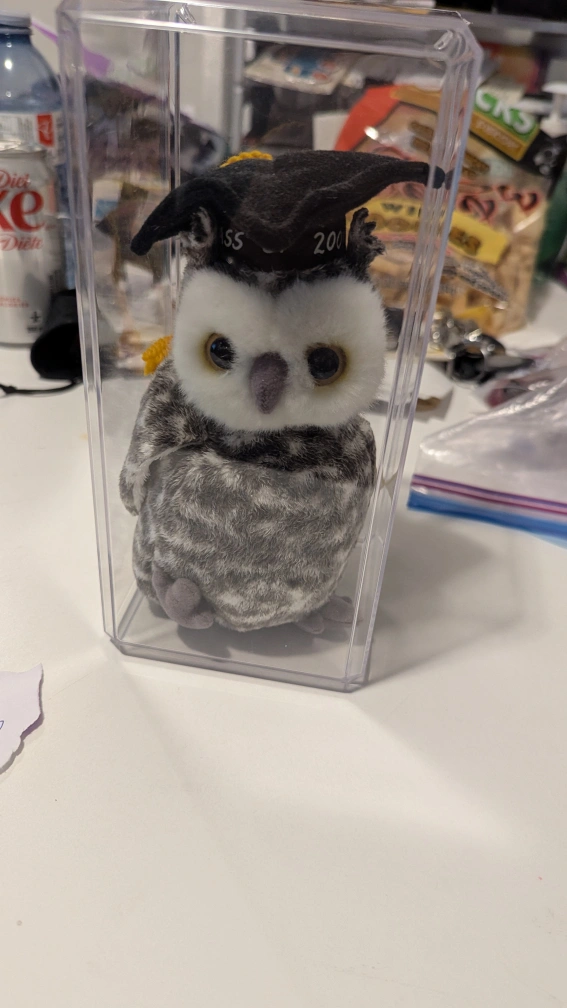 Adorable grey owl plush toy. Wearing a graduation cap. Comes in a clear plastic case. Perfect graduation gift or collectible.