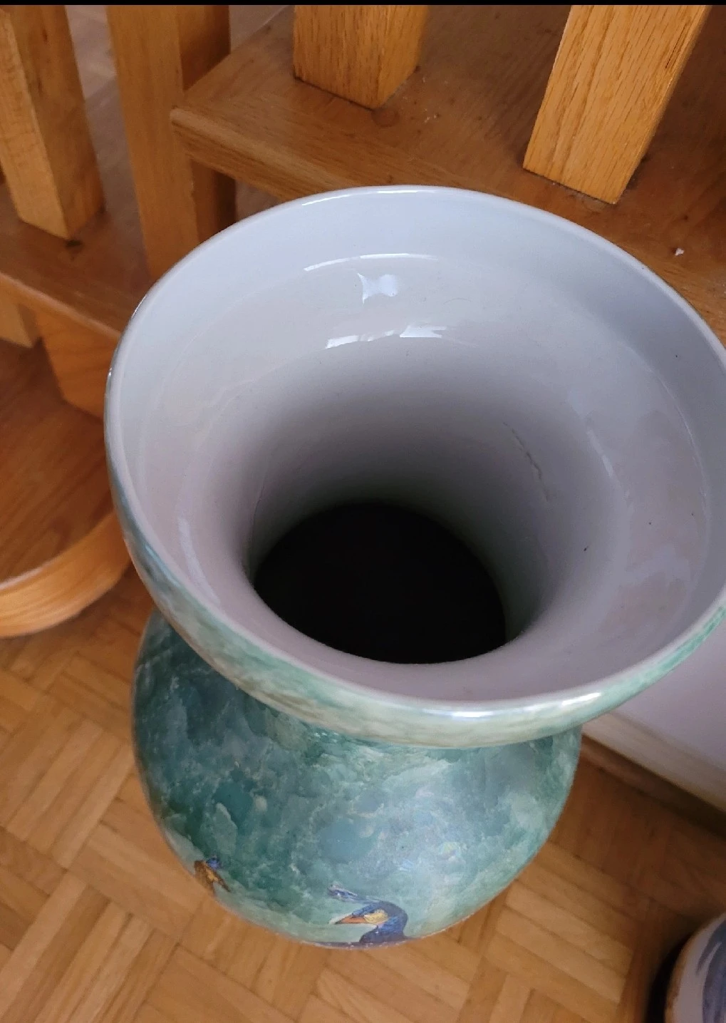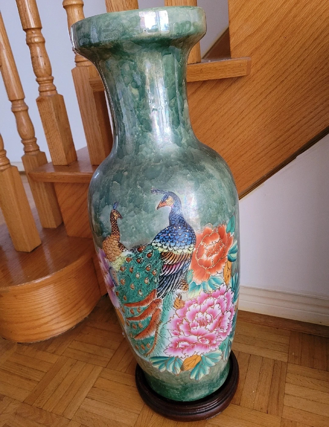 This decorative ceramic vase features a beautiful peacock and floral design with a green speckled finish. It stands on a dark wooden base and has a smooth white interior. A lovely piece for any home!