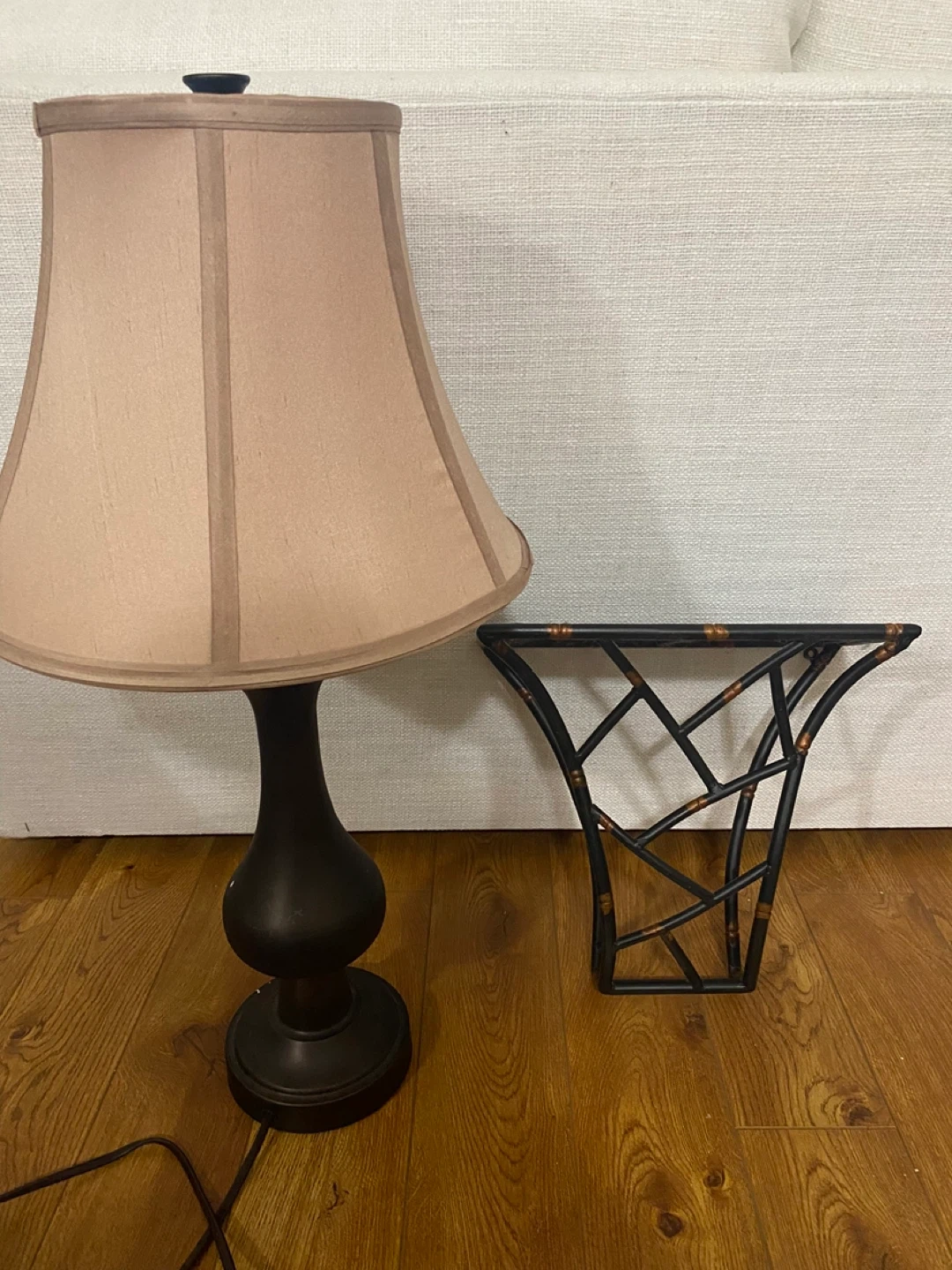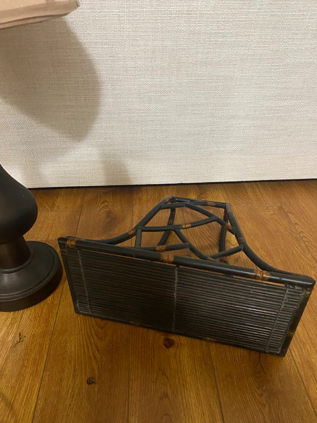 This set includes a stylish table lamp with a neutral-toned shade and a decorative black metal magazine rack with bamboo accents. The lamp has a dark, classic base and a fabric shade. The magazine rack features an open, geometric design.