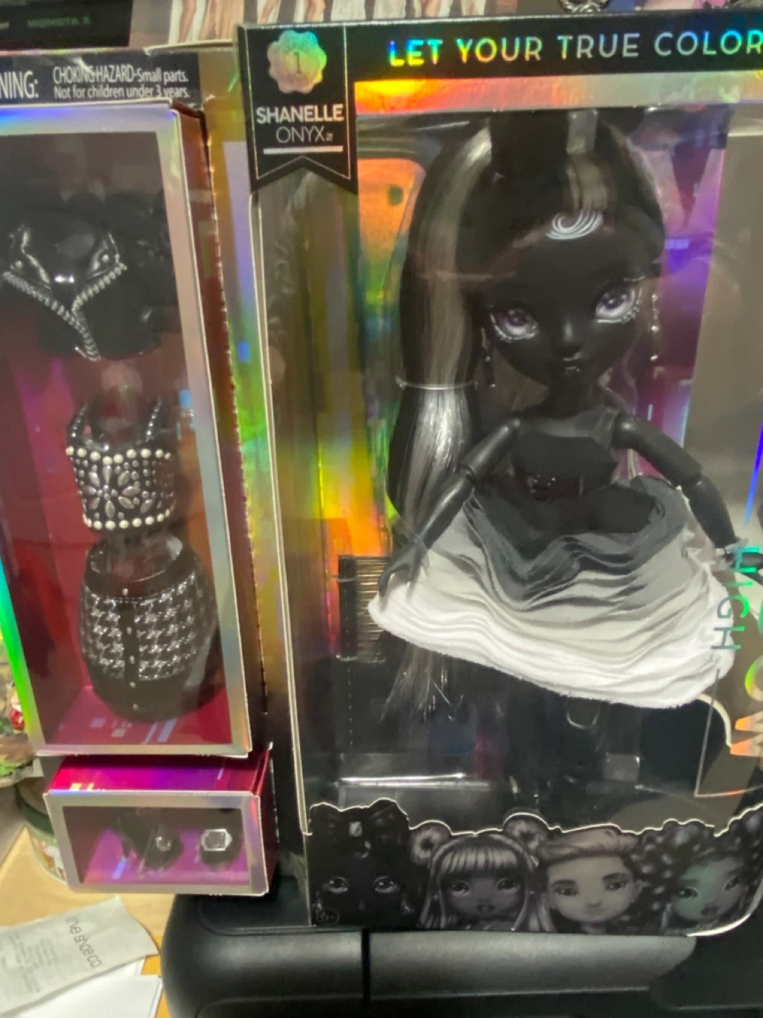 This is a Rainbow High Shadow High doll featuring Shanelle Onyx. It comes with two outfits and accessories. The doll is designed with a striking black and white aesthetic.