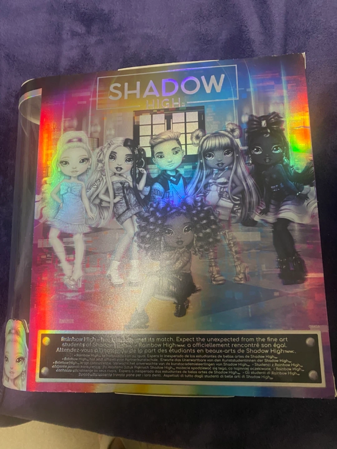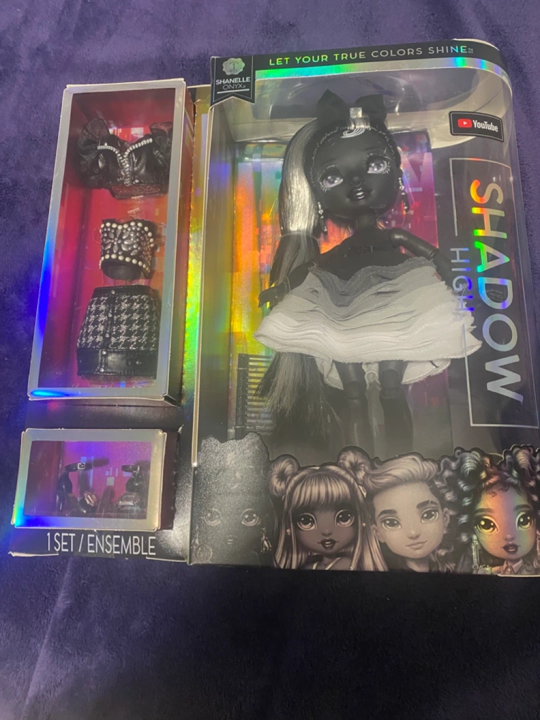 This is a Rainbow High Shadow High doll featuring Shanelle Onyx. It comes with two outfits and accessories. The doll is designed with a striking black and white aesthetic.