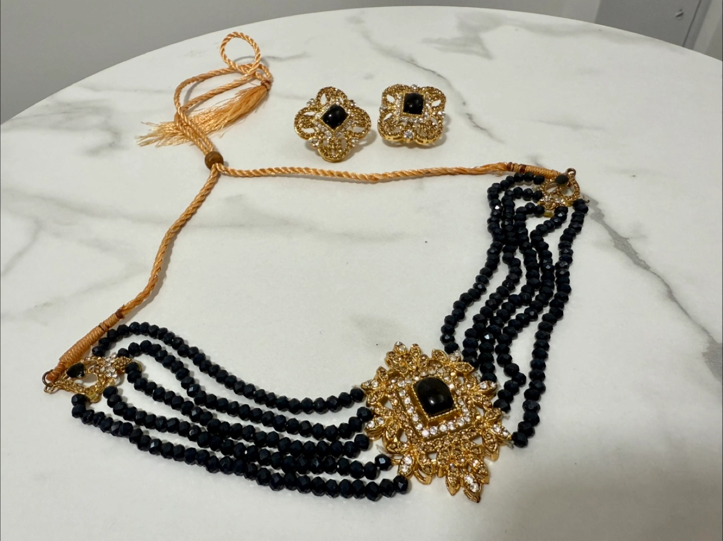 Gorgeous blue beaded necklace and earring set! The necklace features a multi-strand design with a large, ornate pendant. The matching earrings complement the necklace perfectly. A beautiful addition to any jewelry collection