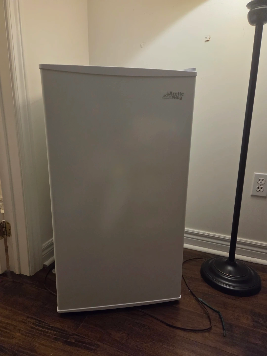 This is an Arctic King mini fridge. It's white and has multiple shelves inside. The back shows the compressor and cooling components.