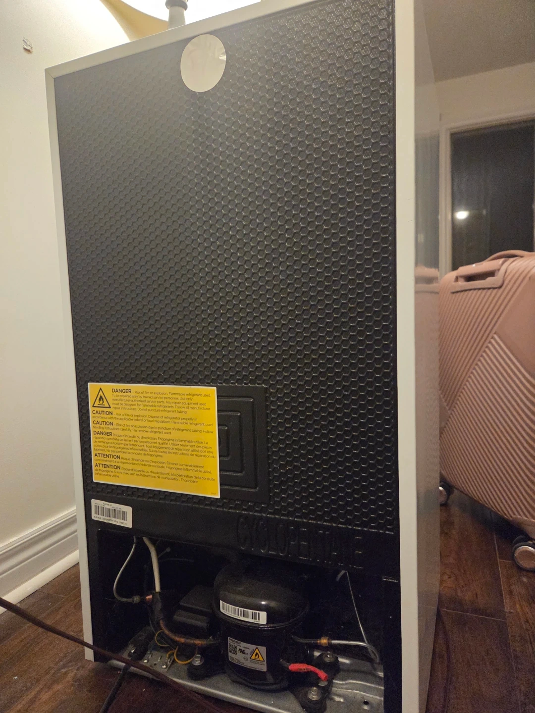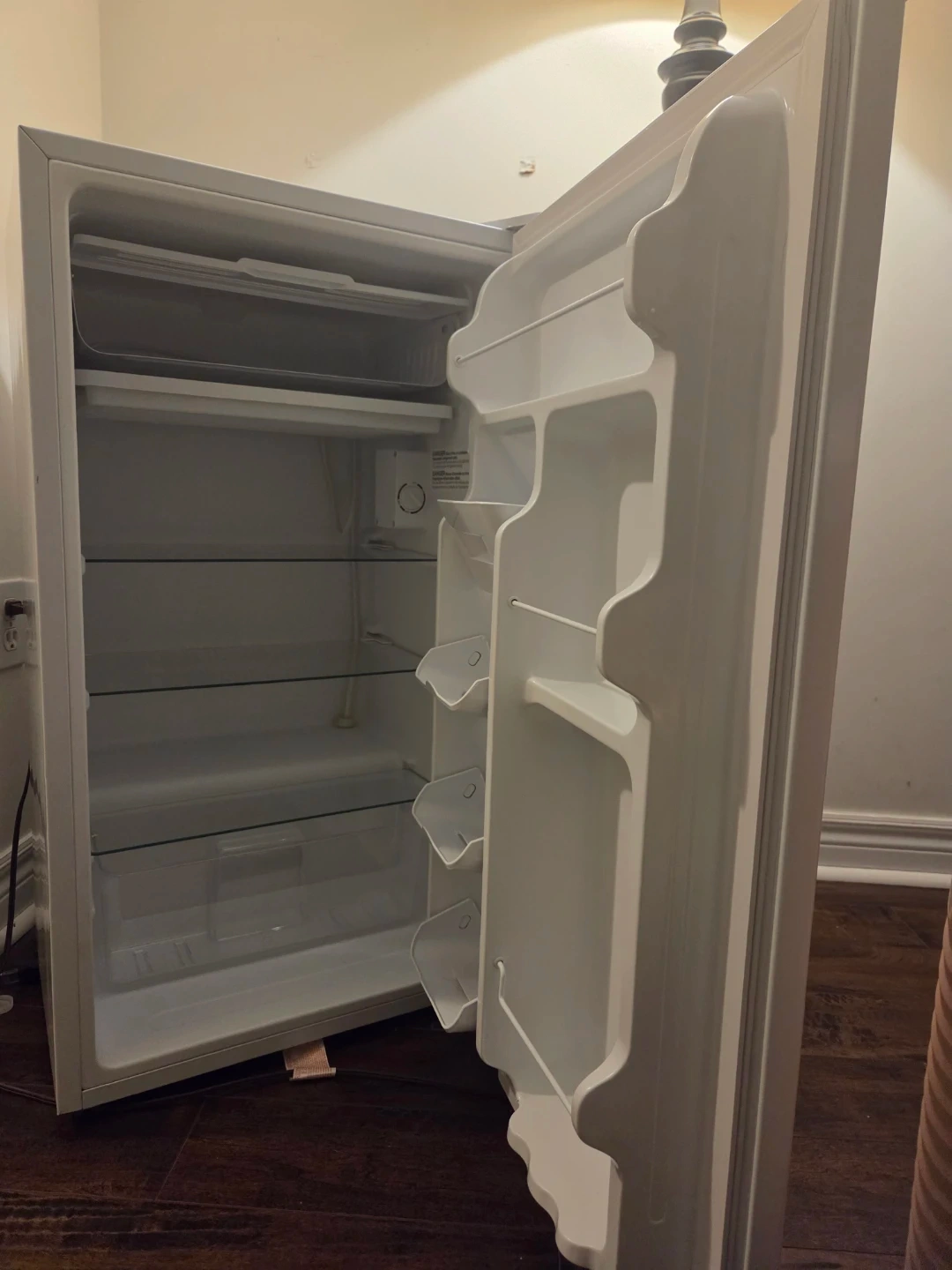 This is an Arctic King mini fridge. It's white and has multiple shelves inside. The back shows the compressor and cooling components.