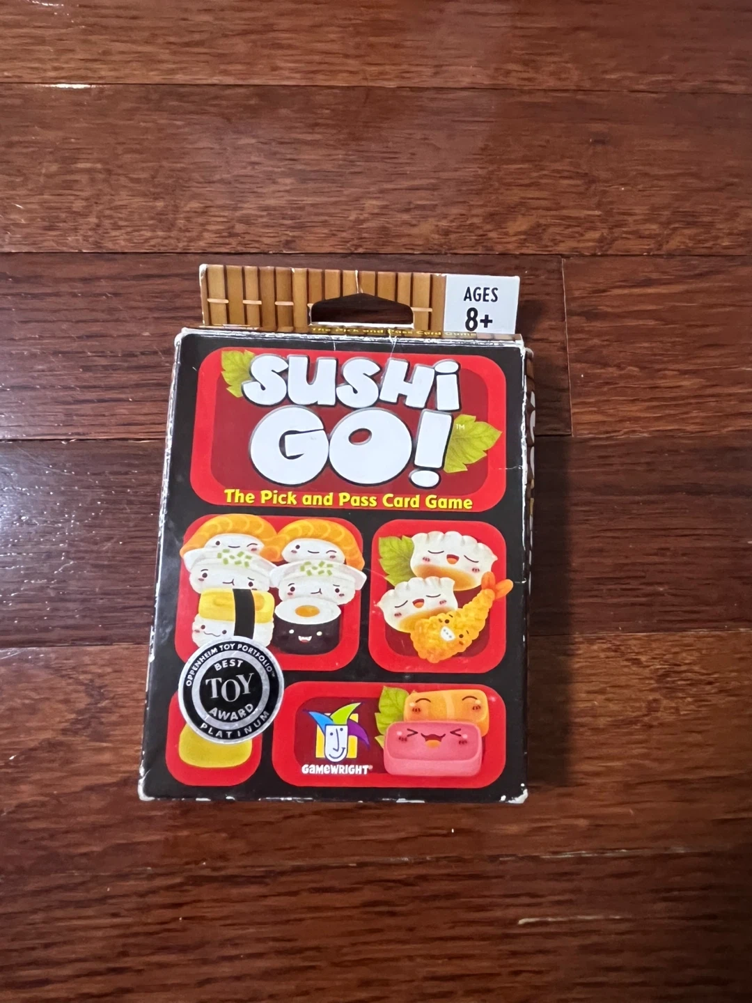 The Sushi Go! Pick and Pass Card Game is for ages 8+. It's a fun card game with cute sushi characters. Gamewright is the brand. A standard deck of Bicycle playing cards is also included.