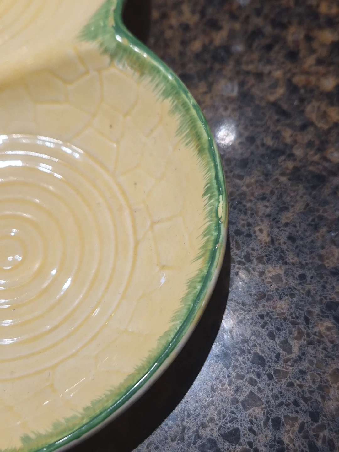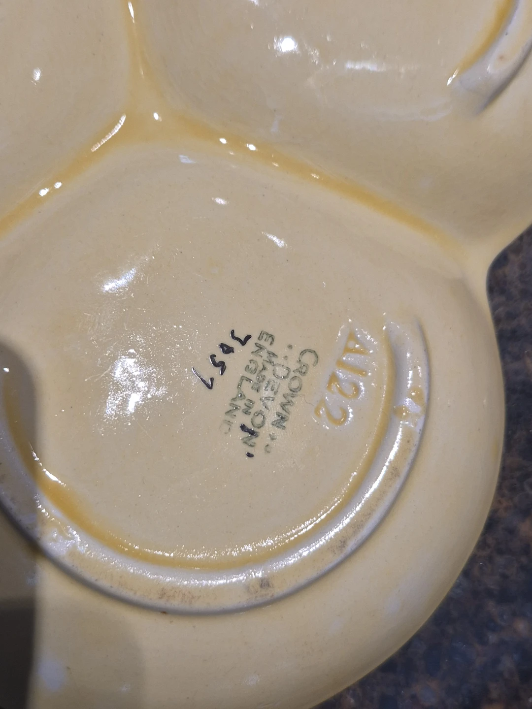 Pretty divided dish from Crown Devon. Features a cheerful floral design with green trim. Perfect for serving relishes or small appetizers! Very minor flaw on edge, see pic. Measures approx 7 inches in diameter