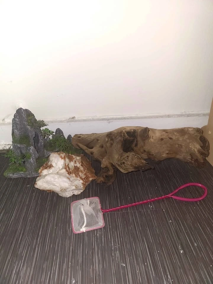 Includes a 20-gallon fish tank with lid and light, a stand, gravel, four fake plants, fish net, large driftwood, rock, two decor pieces, heater, a new, never-used filter, and a water circulation pump. PICK UP AND CASH ONLY.