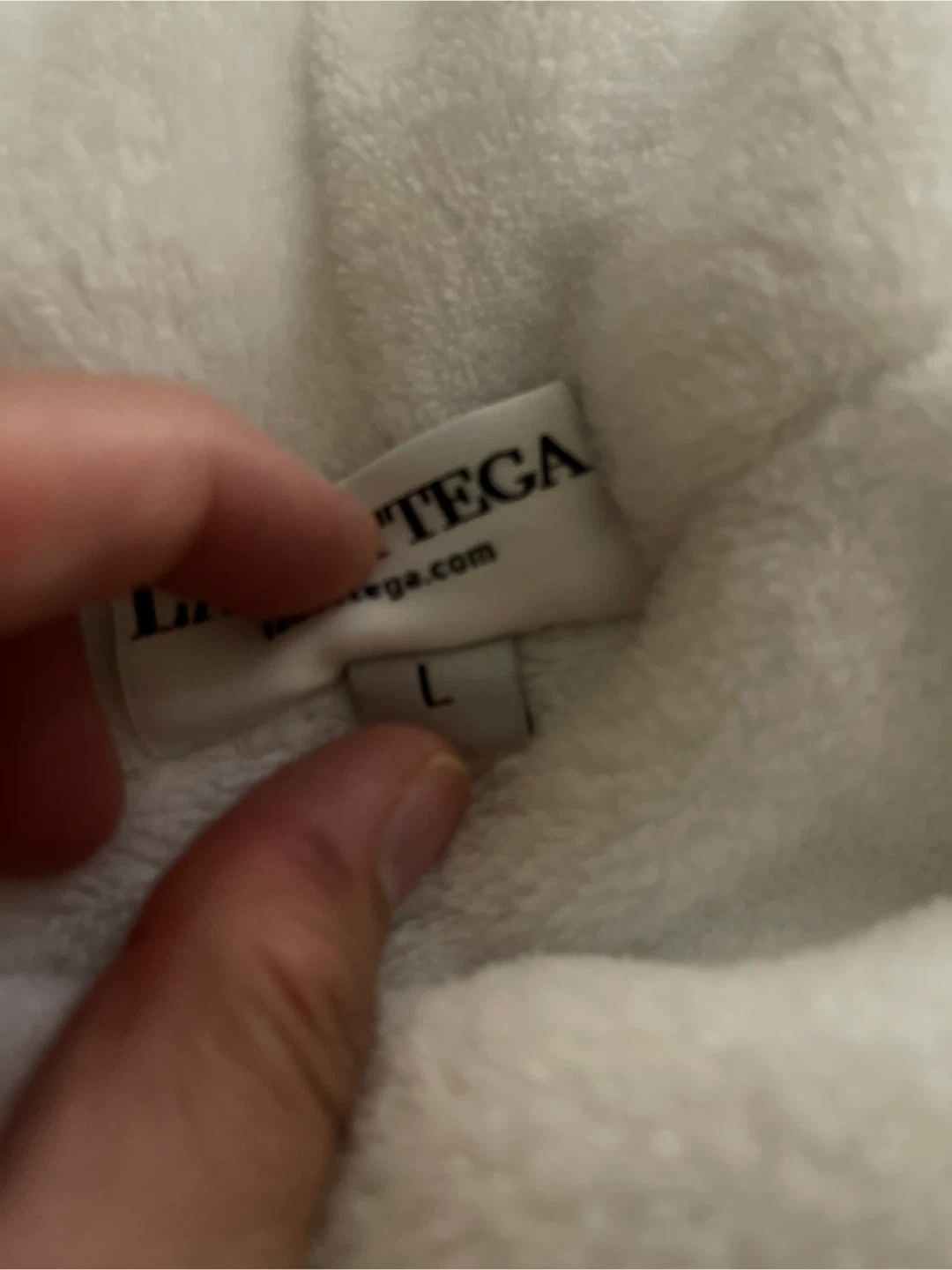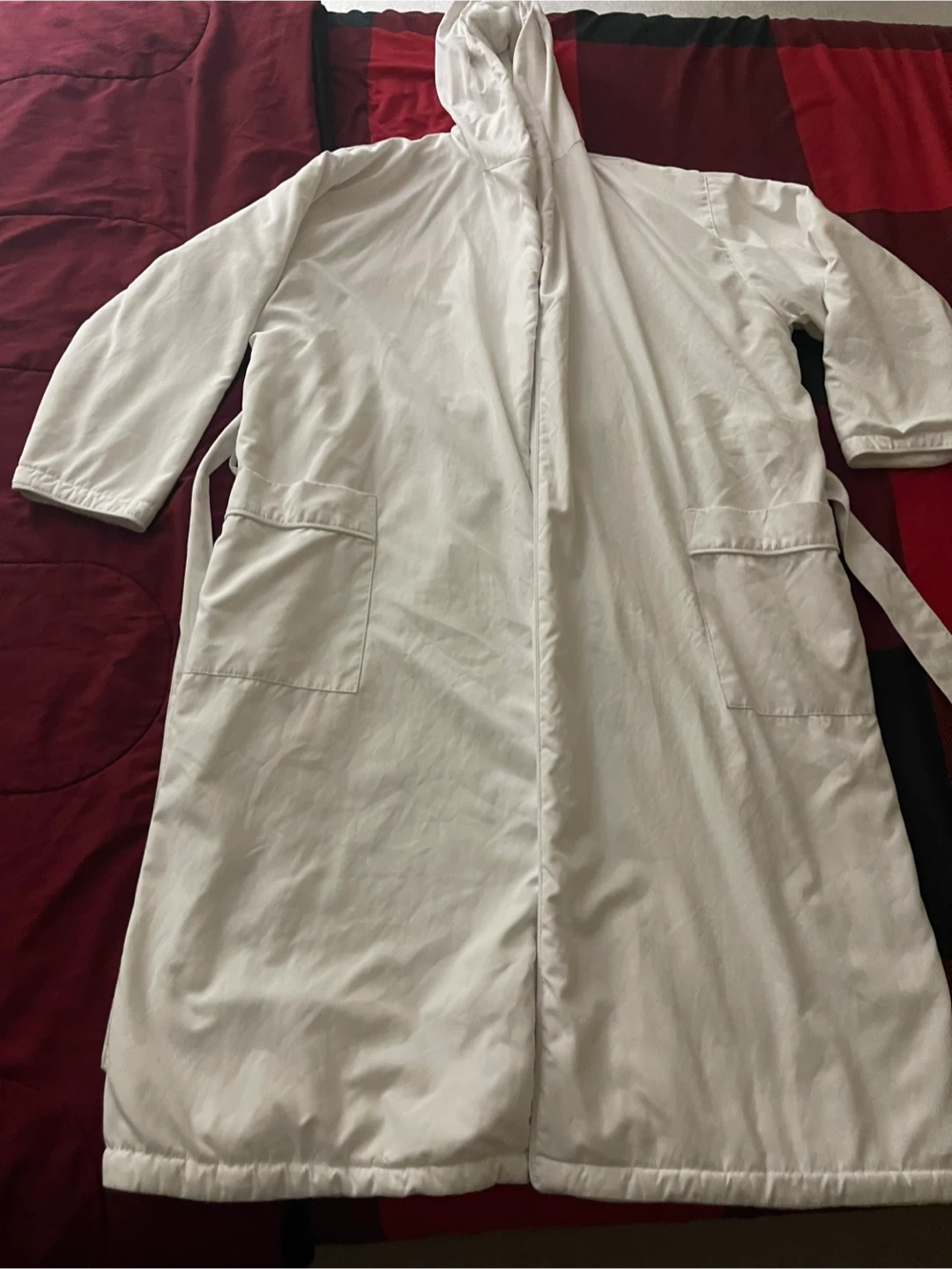 White terry cloth robe with a hood and tie belt. It's a size large and features two front pockets. This robe is perfect for after a shower or lounging around the house! Cash only.