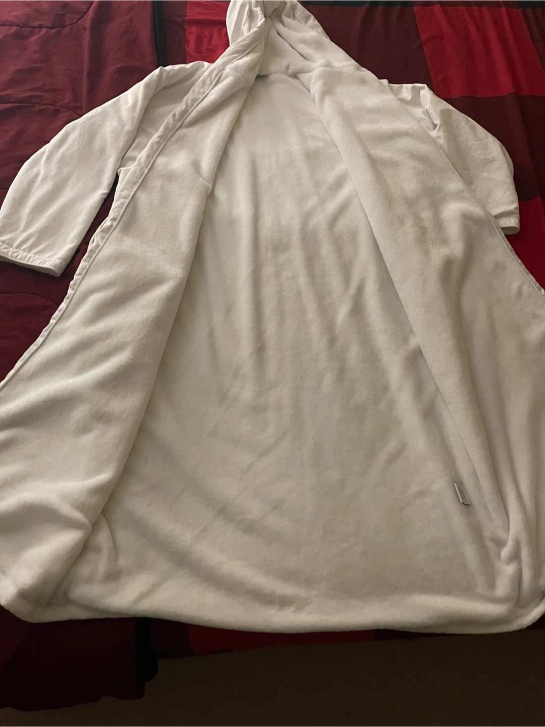 White terry cloth robe with a hood and tie belt. It's a size large and features two front pockets. This robe is perfect for after a shower or lounging around the house! Cash only.