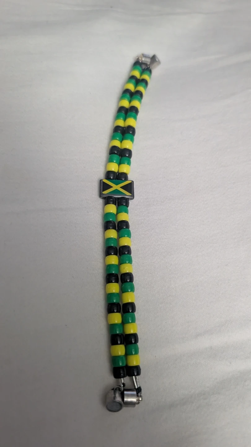 This double-strand beaded bracelet features black, green, and yellow beads, representing the Jamaican flag. It also has a small charm displaying the Jamaican flag. The closure is a silver-tone clasp.