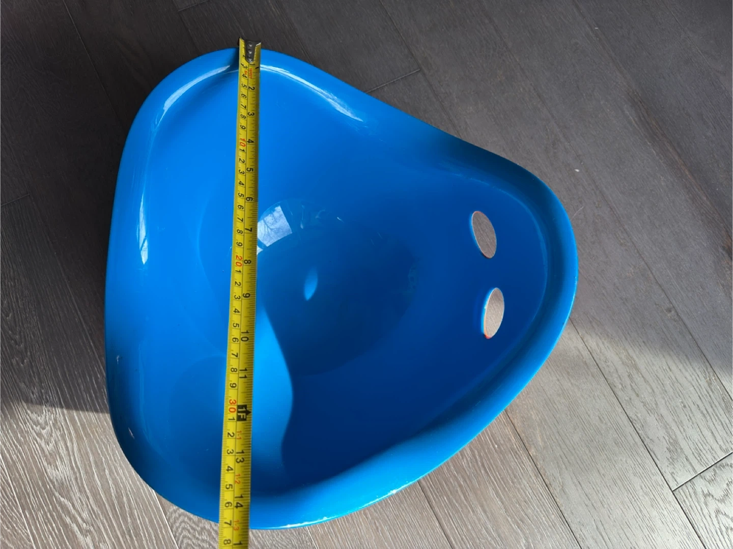 This is a blue plastic wobble seat, sometimes called a scoop chair. It measures about 15 inches in length and 12 inches in height. It's made of durable plastic and has two holes for stability or carrying. Great for sensory play or quiet time!