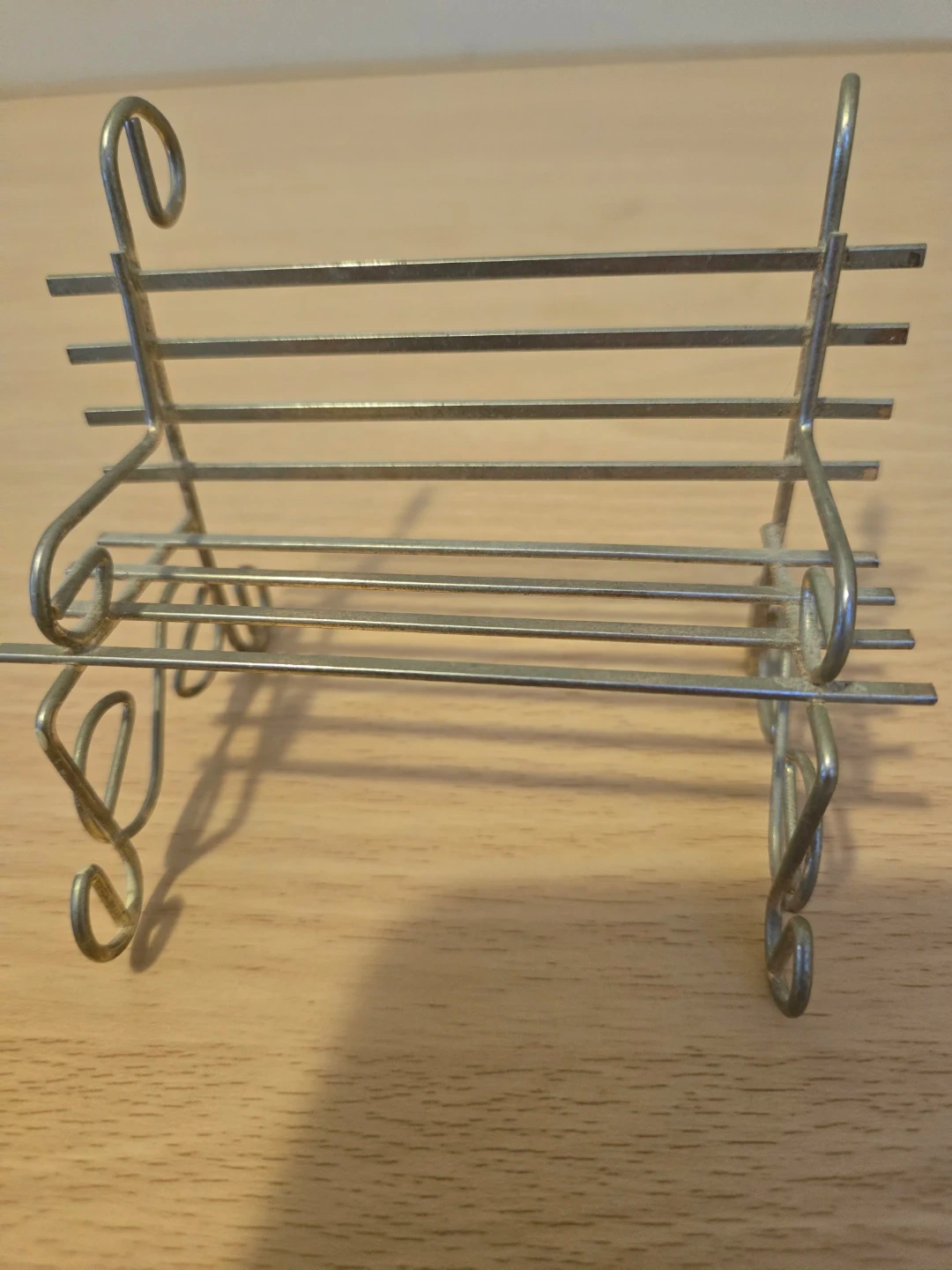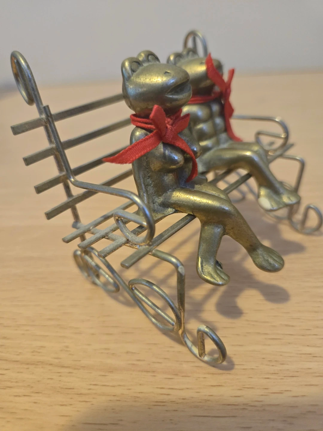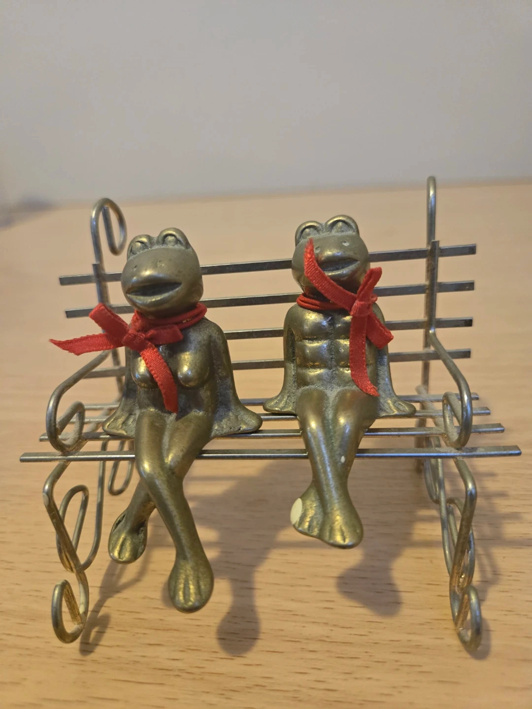 Cute brass figurines of two frogs sitting on a miniature park bench. They're wearing tiny red scarves. This charming piece would add a whimsical touch to any shelf or desk.
