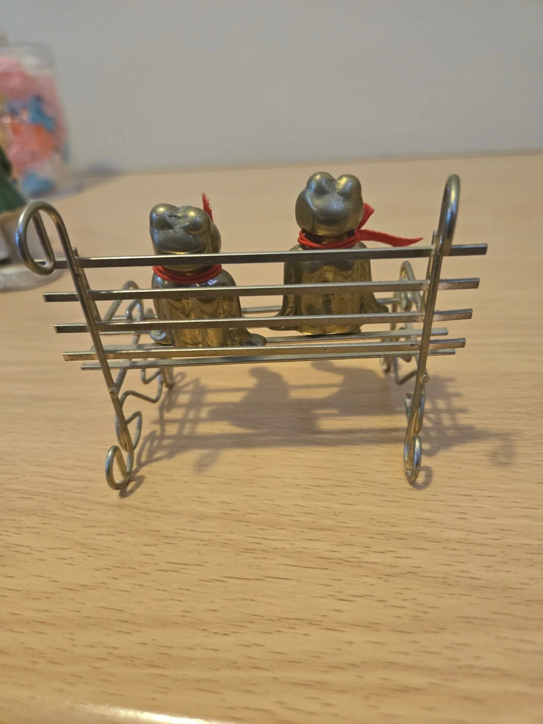Cute brass figurines of two frogs sitting on a miniature park bench. They're wearing tiny red scarves. This charming piece would add a whimsical touch to any shelf or desk.