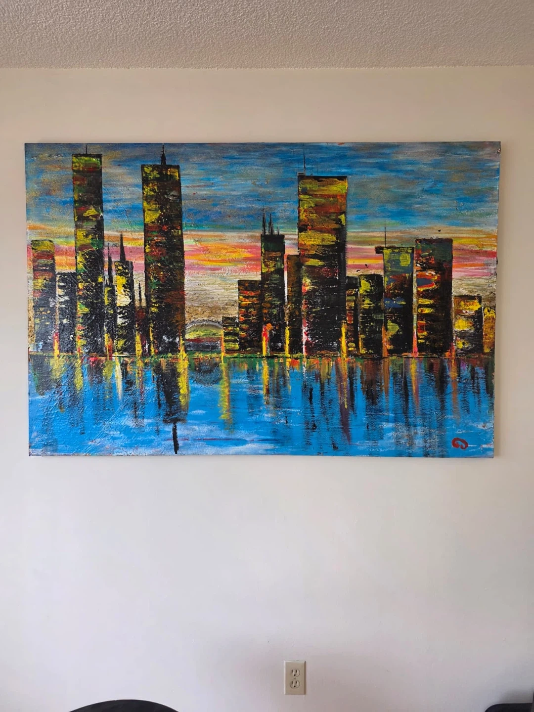 Textured acrylic painting depicting a vibrant cityscape at sunset with colourful reflections. The artwork showcases bold brushstrokes creating a unique, tactile finish. It's a large piece, perfect for adding a pop of colour to any room!