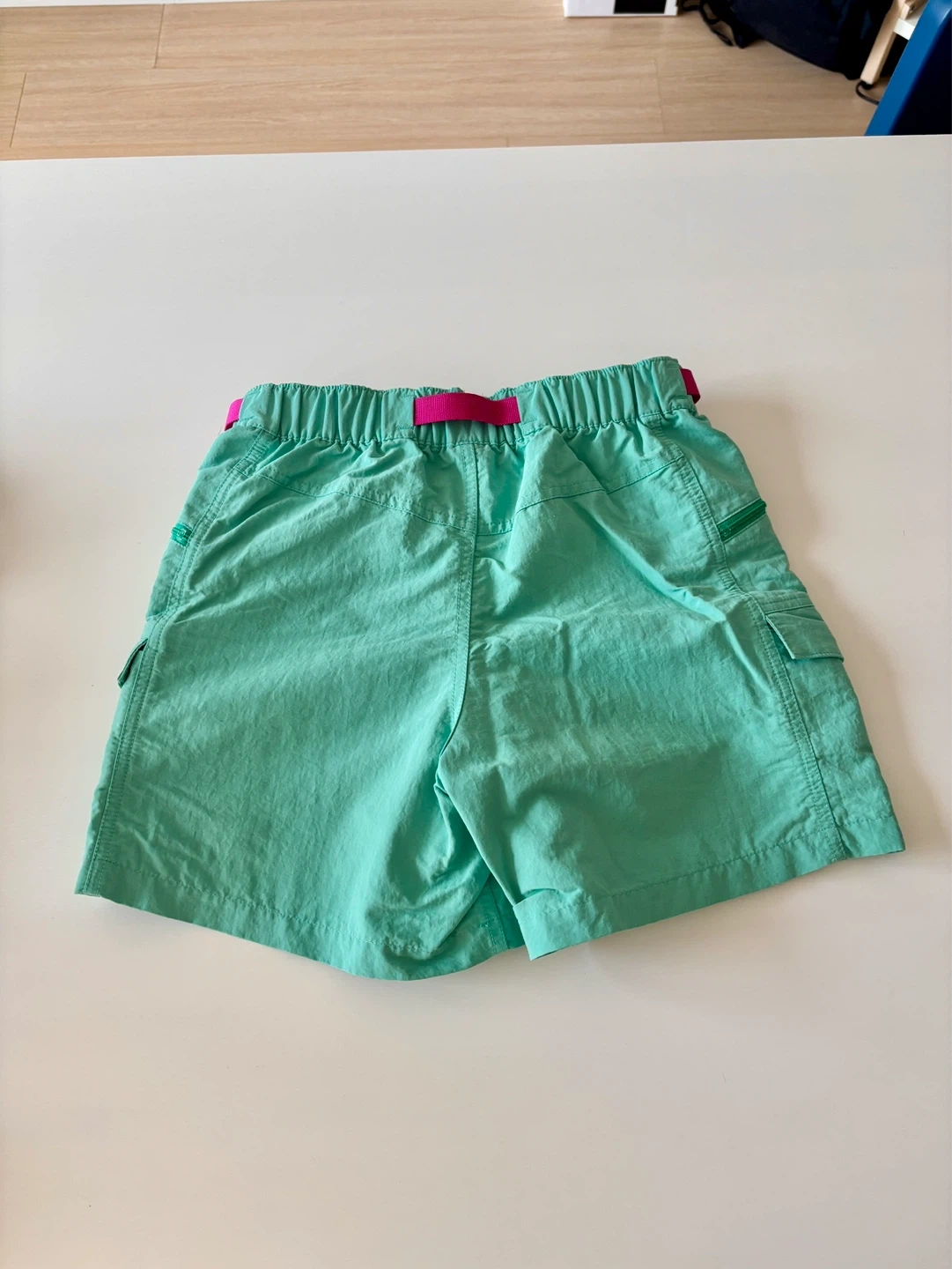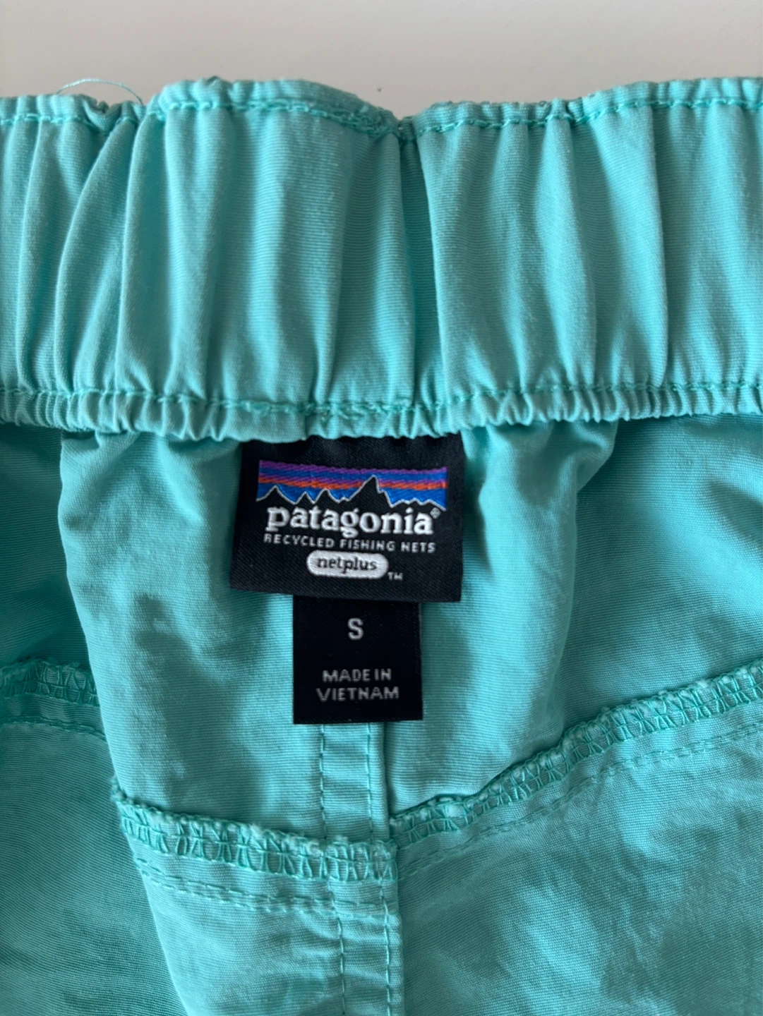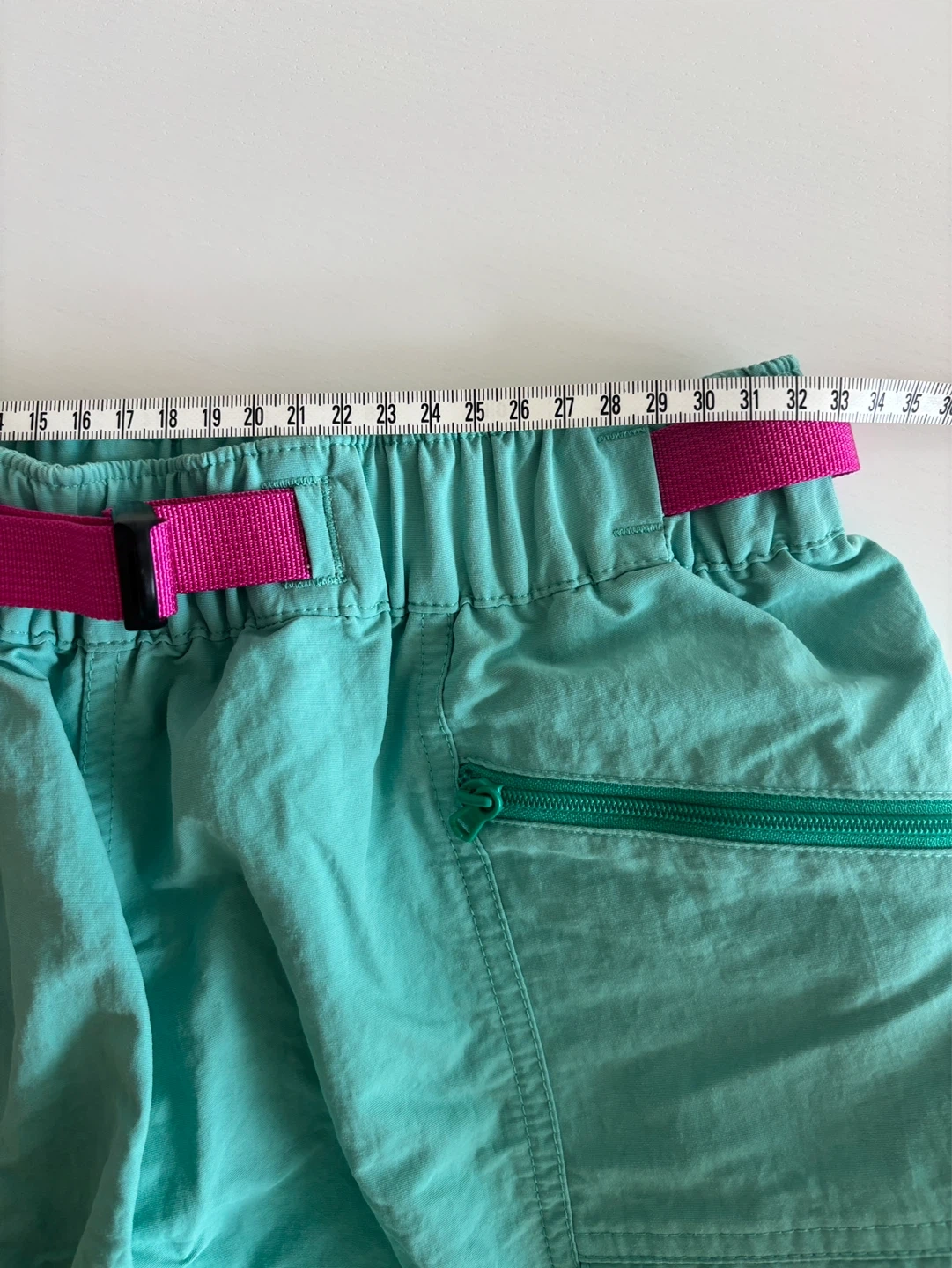 These are Patagonia shorts in a bright aqua colour. They feature an elastic waistband with an adjustable pink belt and multiple cargo pockets with zippers. Made from 100% recycled nylon.