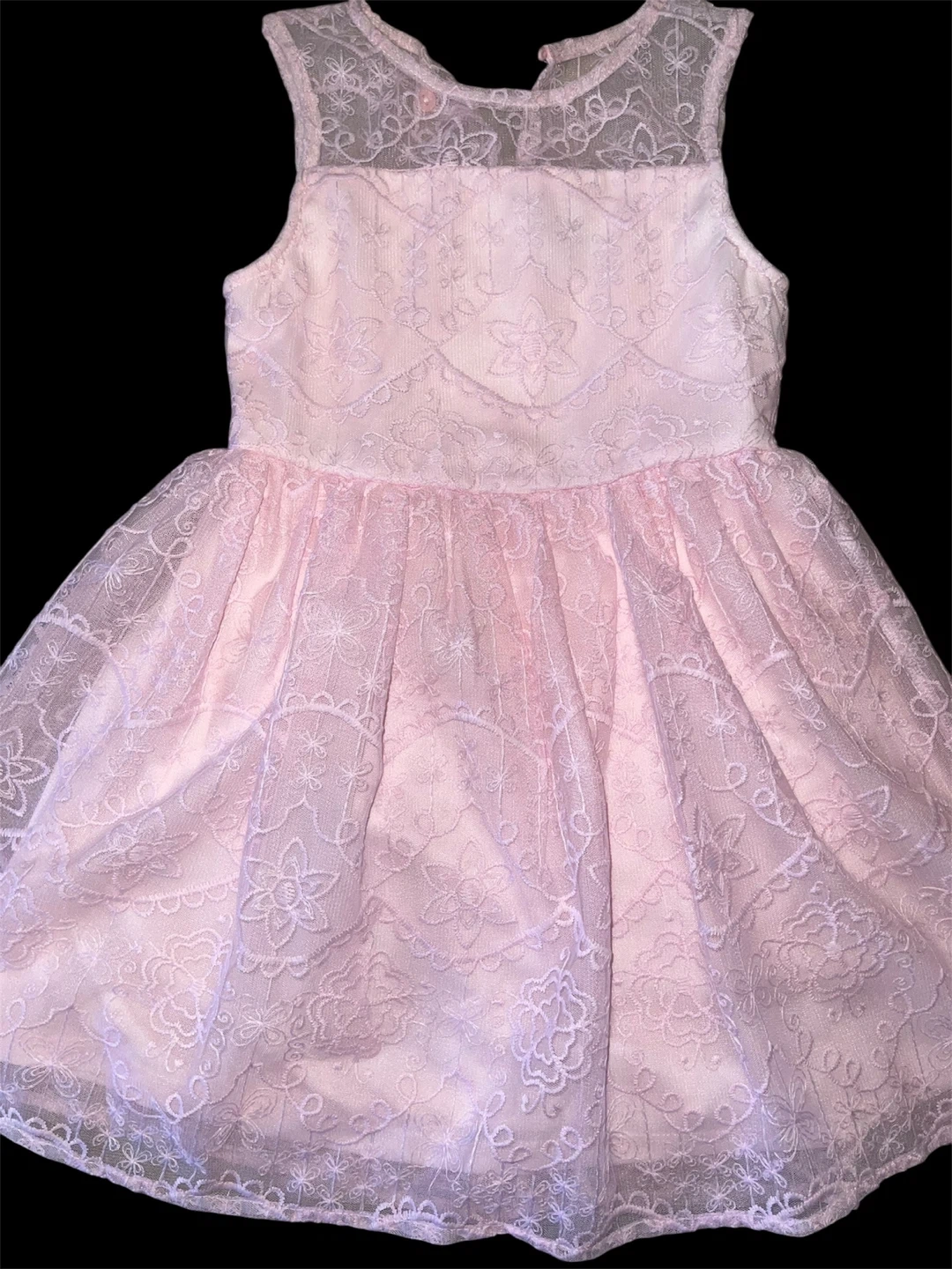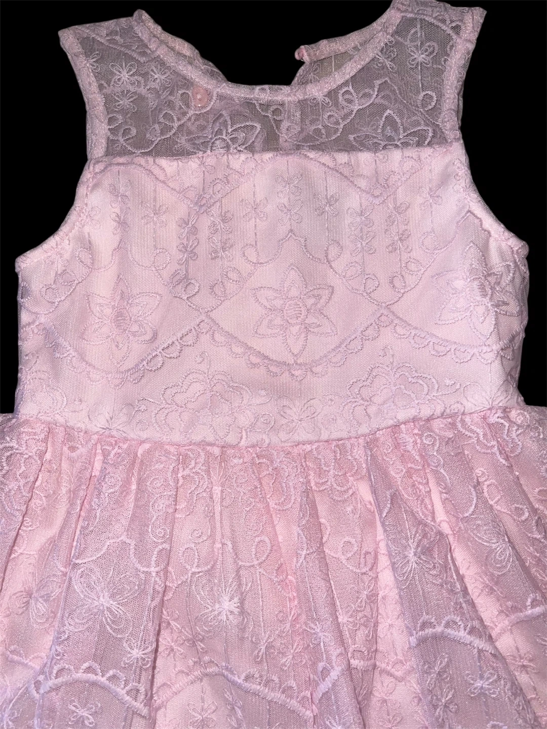 This adorable pink dress features delicate lace detailing all over. It has a sleeveless design with a sheer lace neckline. Perfect for special occasions or parties!
