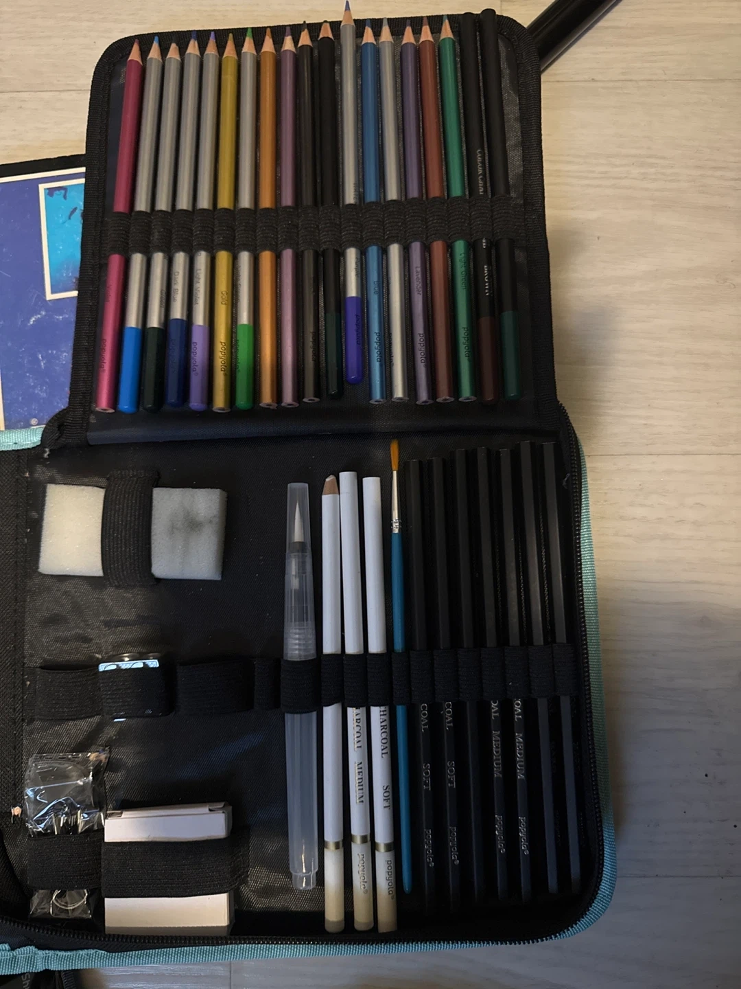 Selling an artist pencil set that comes with a case. It includes a variety of coloured pencils, charcoal pencils, blending stumps, and other art supplies. Perfect for drawing and sketching!