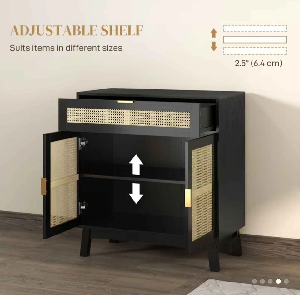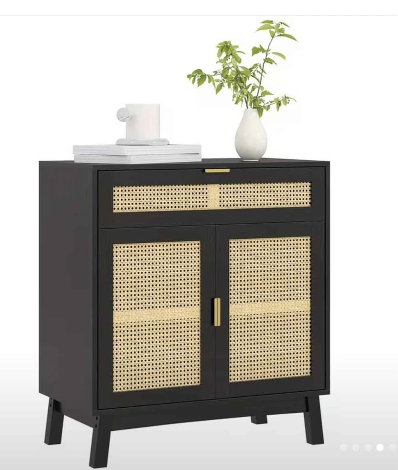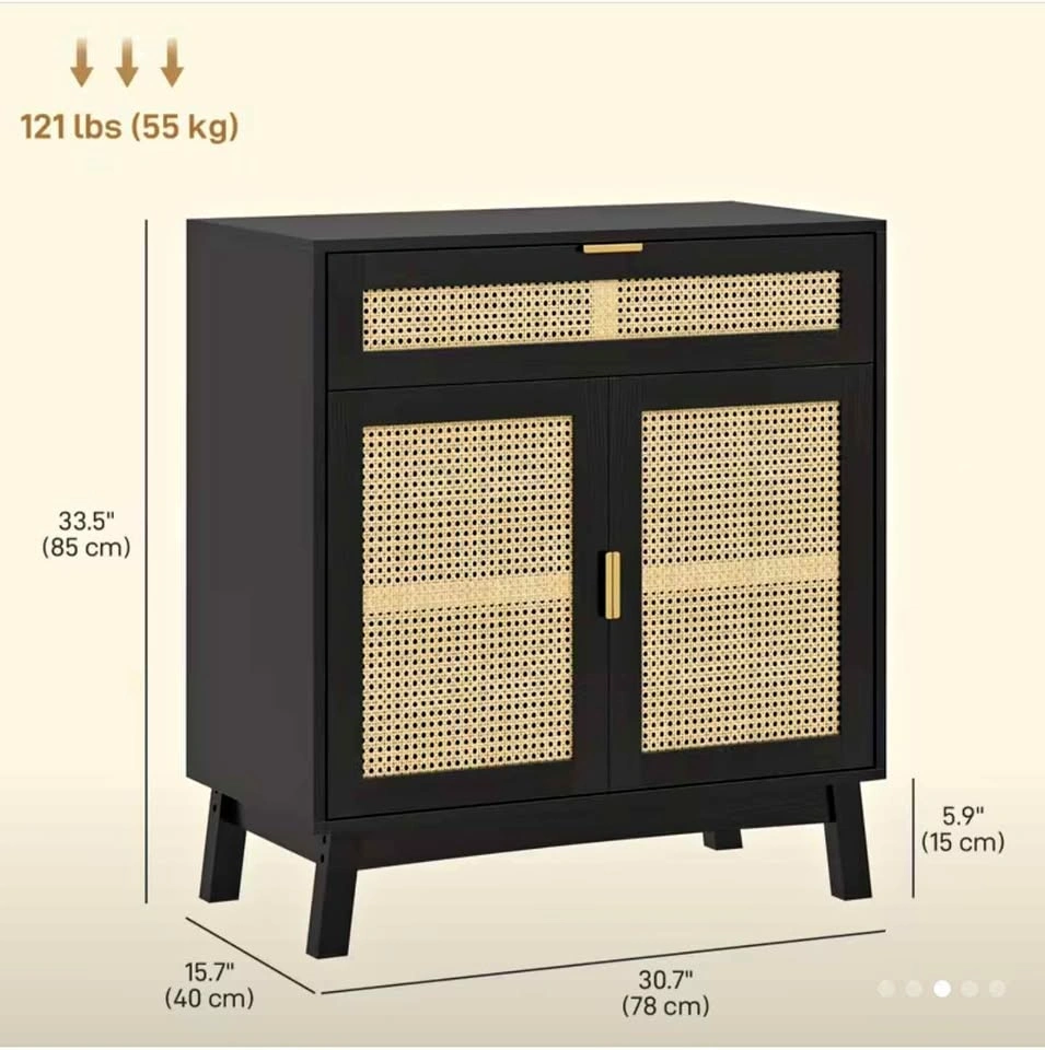 Stylish and functional storage cabinet with a modern black finish and natural rattan panels. Features an adjustable interior shelf, a spacious drawer, and a double-door cabinet. Sturdy construction with a weight capacity of 121 lbs. Elevated legs for easy cleaning. Dimensions: Height: 33.5", Width: 30.7", Depth: 15.7". Perfect for living rooms, entryways, bedrooms, or dining areas.