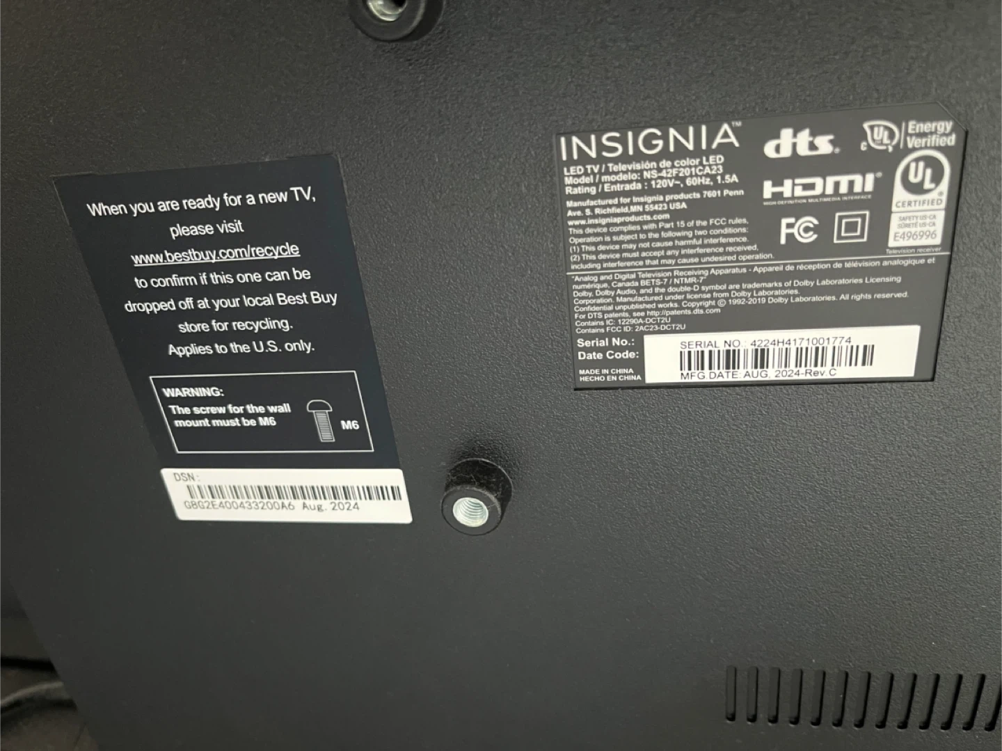 This Insignia 43-inch LED TV is a great addition to any room. It supports HDMI and USB inputs for all your devices. The manufacturing date is August 2024.